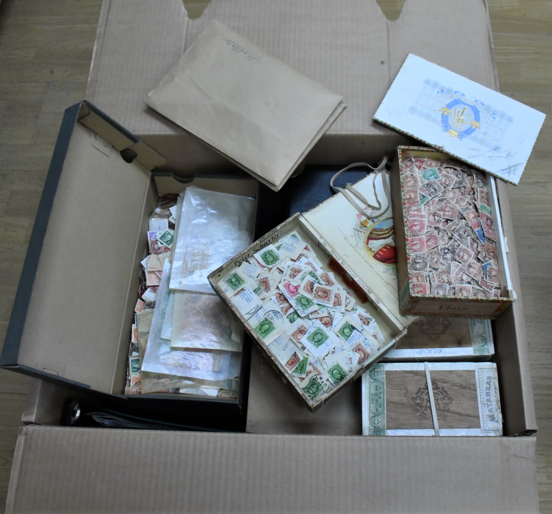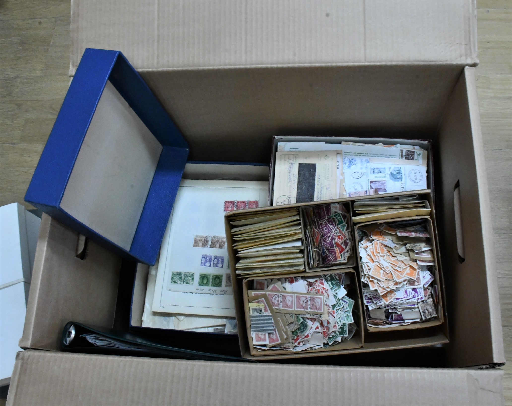 Sweden. Accumulation used 1880s–1960s. Several thousands of stamps sorted or unsorted in boxes, glassine envelopes, envelopes and three binders, all housed in a removal box. Some pictures are presented at www.philea.se. Approx. 15 kg. (>1000s)