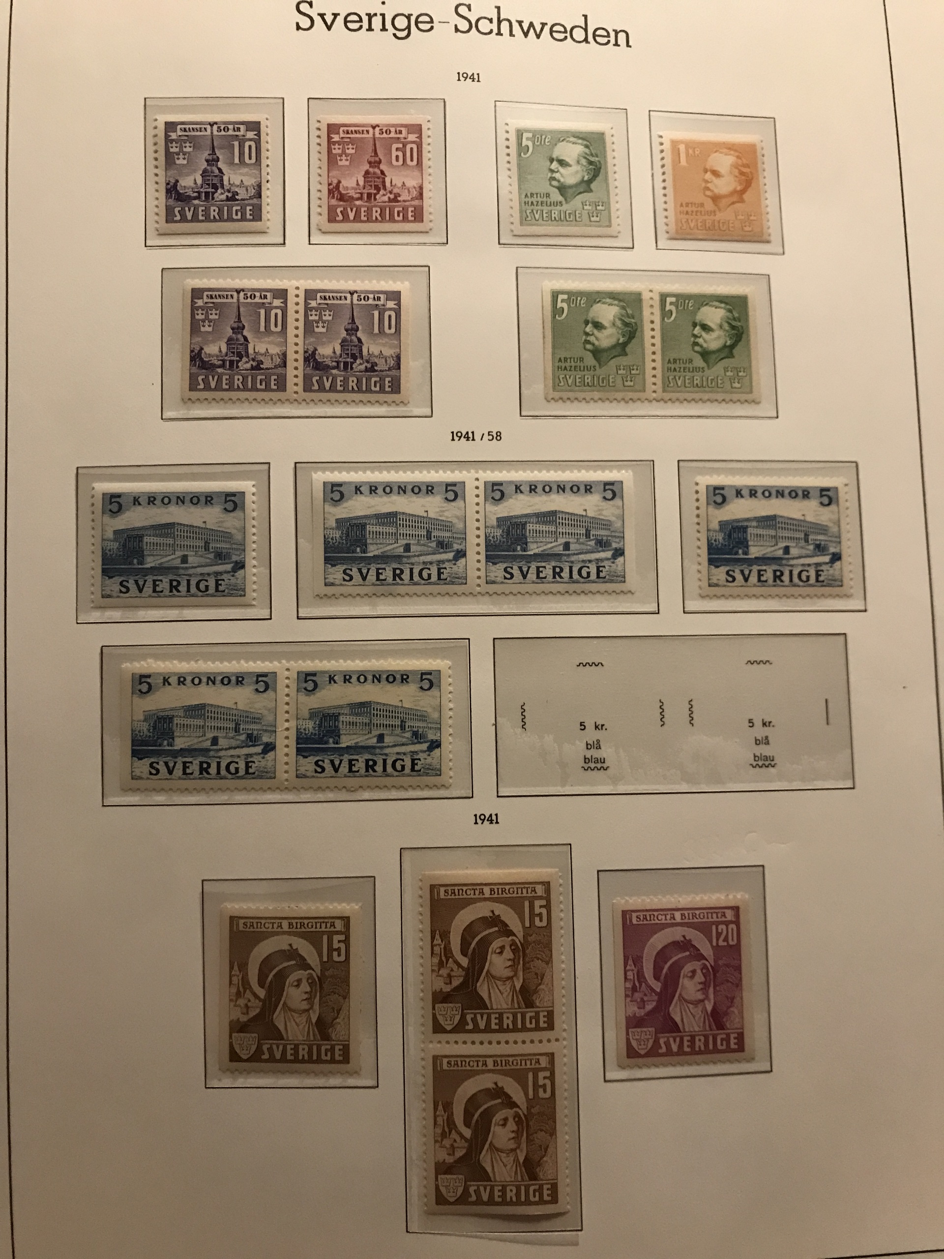 Sweden. ★★/★. Collection Circle types–1973 in Leuchtturm album incl. e.g. some Congress, some ** BC/CB-pairs incl. Royal Castle BC etc. Apparently cpl from 1942. Also some early used.