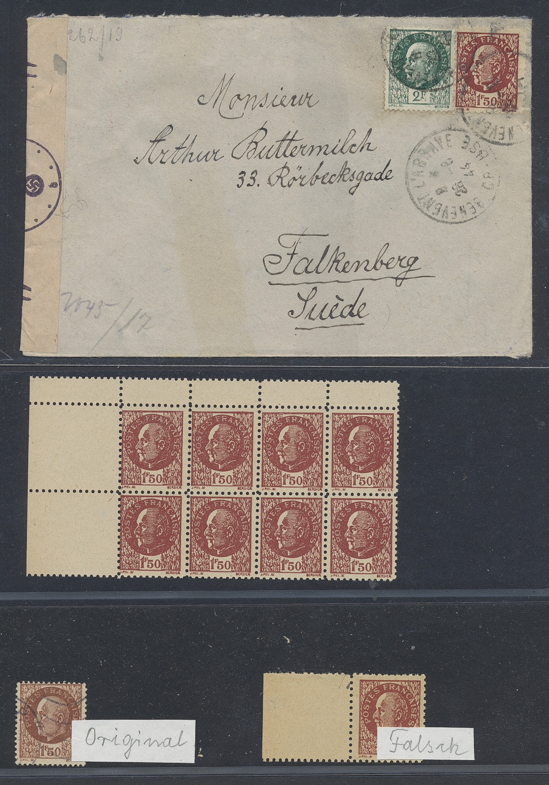 Germany, war forgeries WW2. Michel 42 ★/⊙, 1944 General Petain 1.50 Fr brown-red. 9 examples unused with a block of 8 together with a cover franked with 2 Fr and a false 1.50 Fr sent to Sweden in 1944. Also one ordinary for comparaization. Unusual, not prized in Michel.