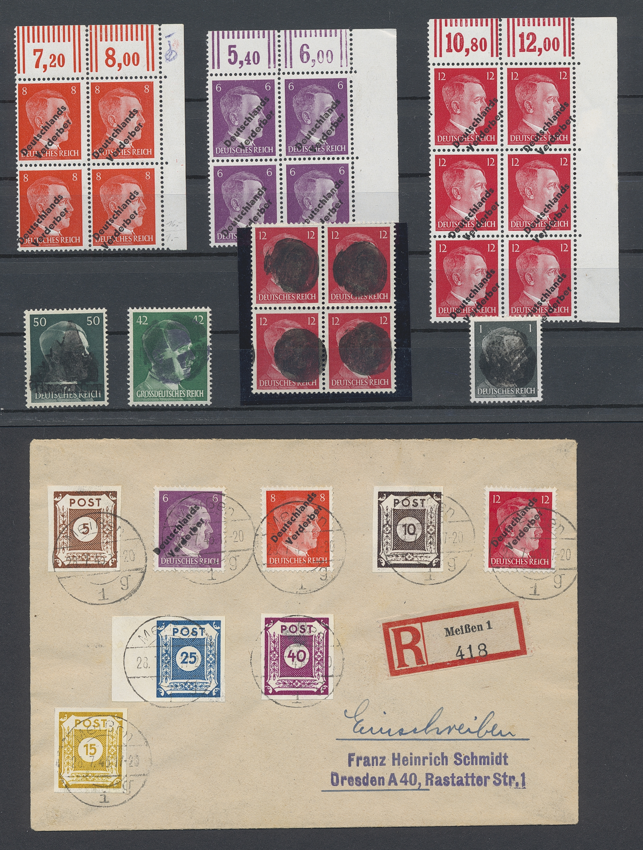 Germany, local issues. Mostly ★★. 1945 Meissen Schwarzenberg and Bad Schmiedeberg overprints on Hitler. Also a registered cover with a range of local issues sent from Meissen 28.7.45 to Dresden. Arr pmk on reverse.