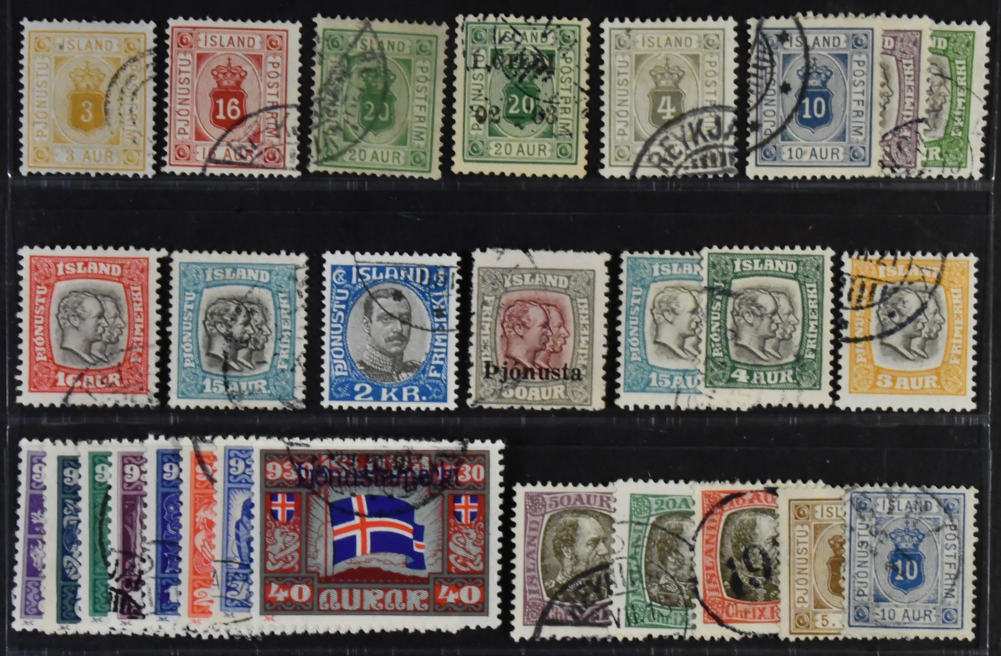 Iceland. Used 1876–1930. Officials. All different, e.g. Tj 4, 7-8, 11, 13, 25, 38, 41, 51, 58-64, 67-68. Mostly good quality. F SEK 8420 (28)