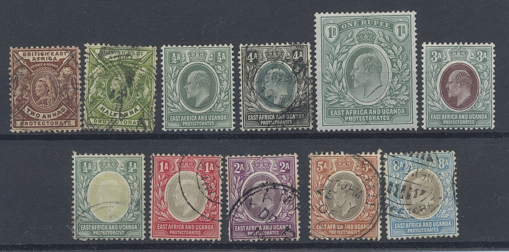 British East Africa and Uganda. ★/⊙. Small lot of 11 stamps up to 1R.