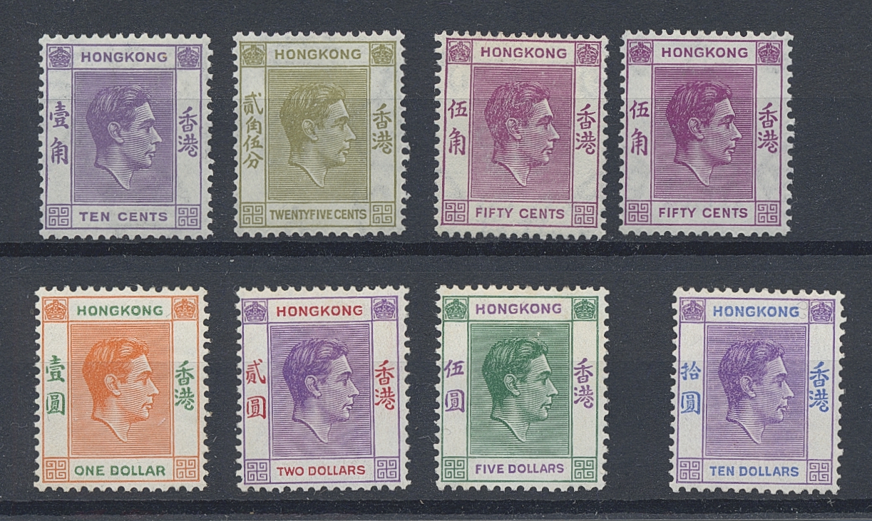 Hong Kong. Michel 144–61 ★, 1938 King George VI. Niice grup of eight stamps up to 10$ including two different 50 c. SG £350.