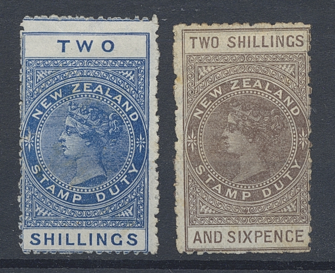 New Zealand. New Zealand Stamp duty SG 57, 69 *, 1895–1903 2s6d blue, and brown. Rough perforation, SG 57 nwithout gum.