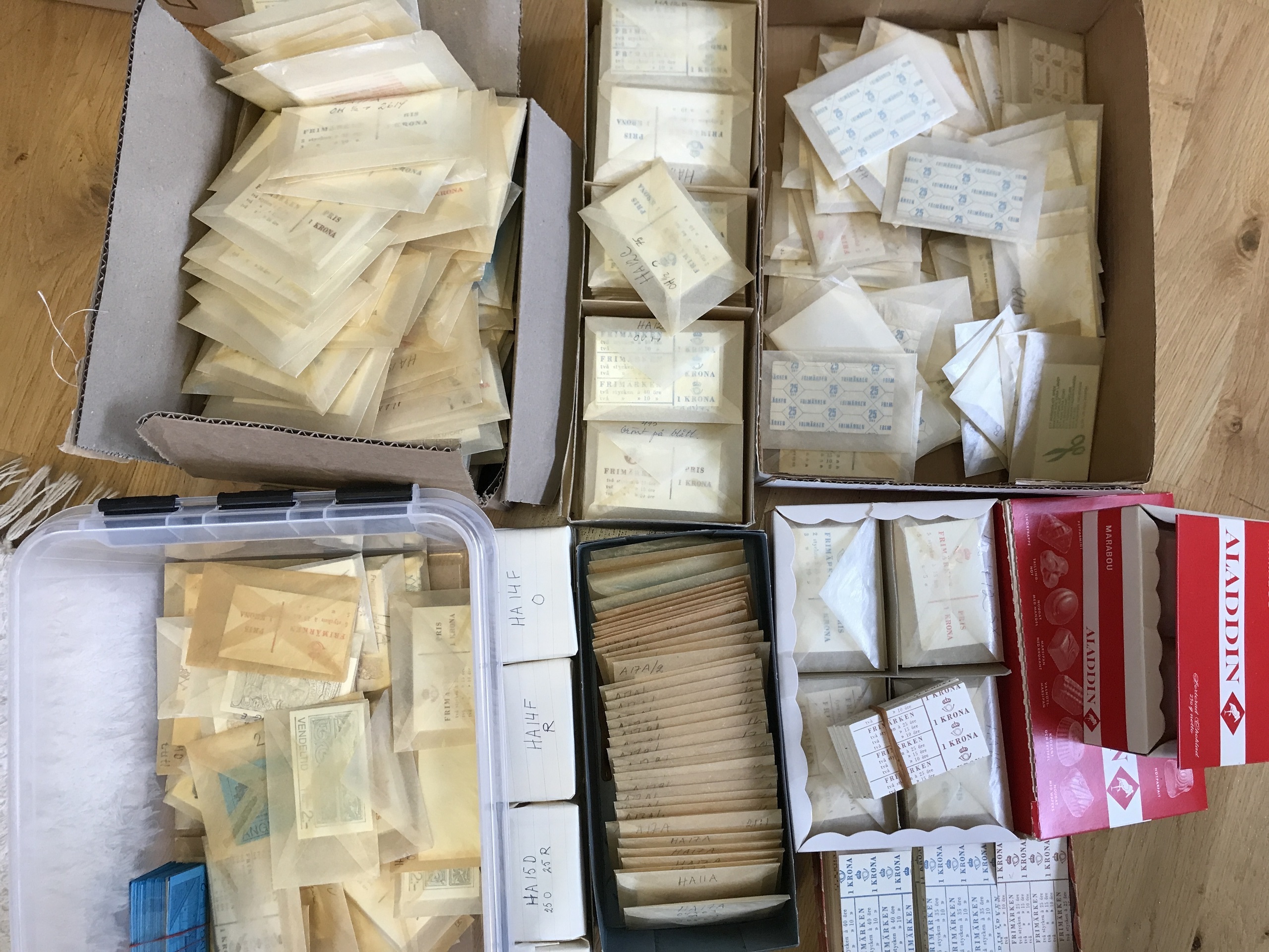 Sweden. Booklets. Box with at least 1000 slot-machine booklets HA1-25. E.g. ten HA1 incl. three R, 12 HA2, 20 HA5, 72 HA16, with different margin signs, etc. Approx. 7 kg.