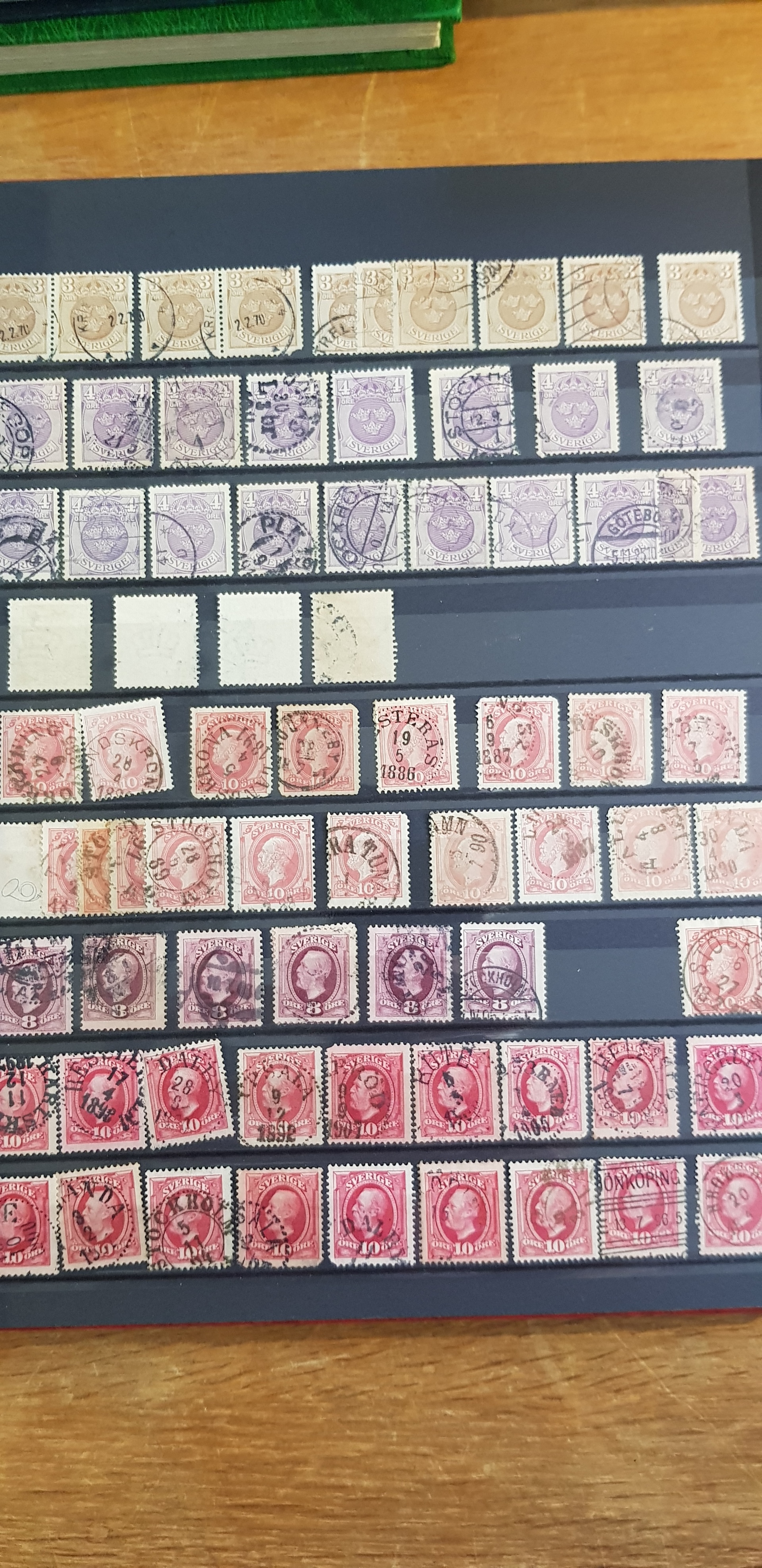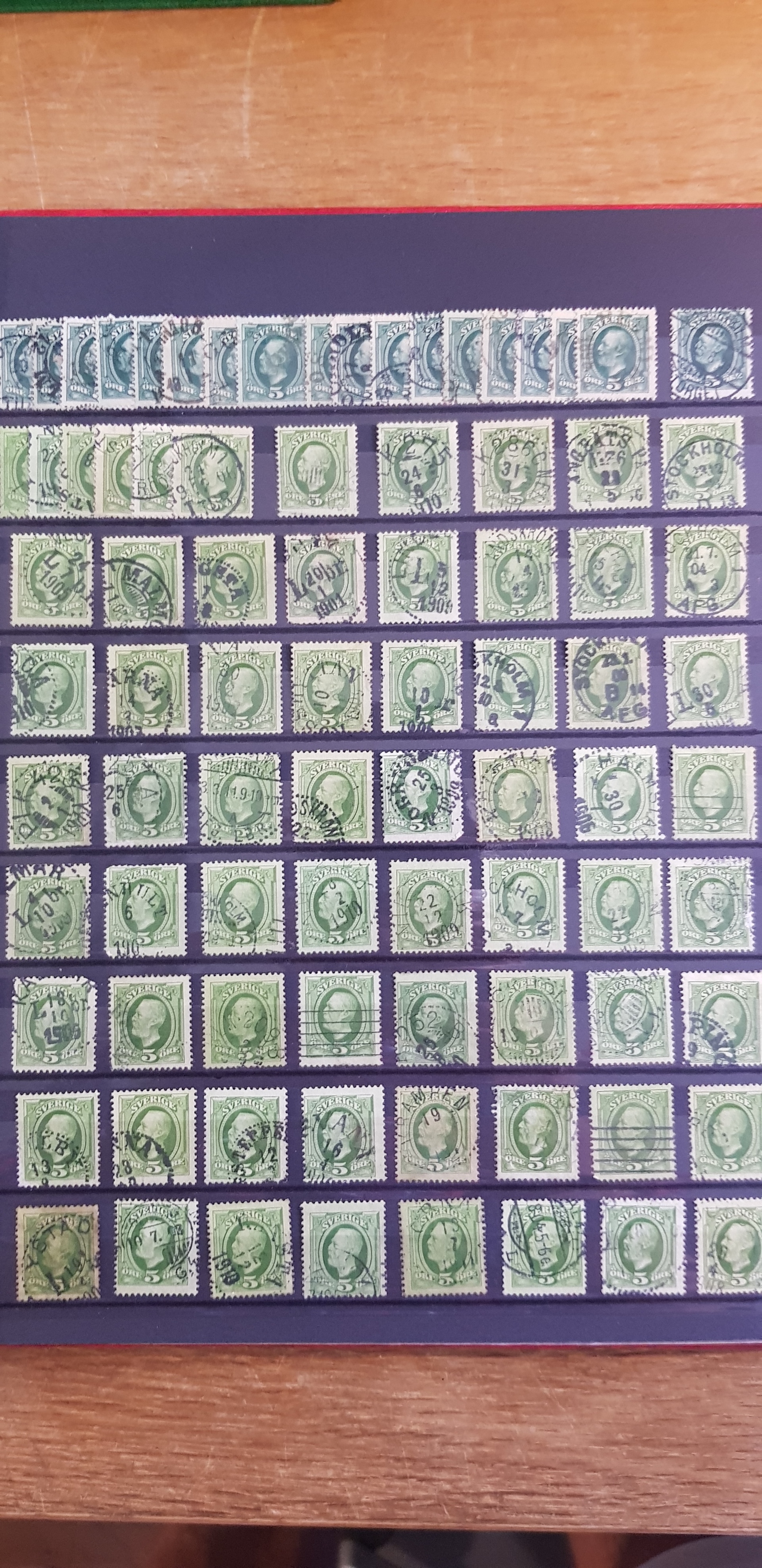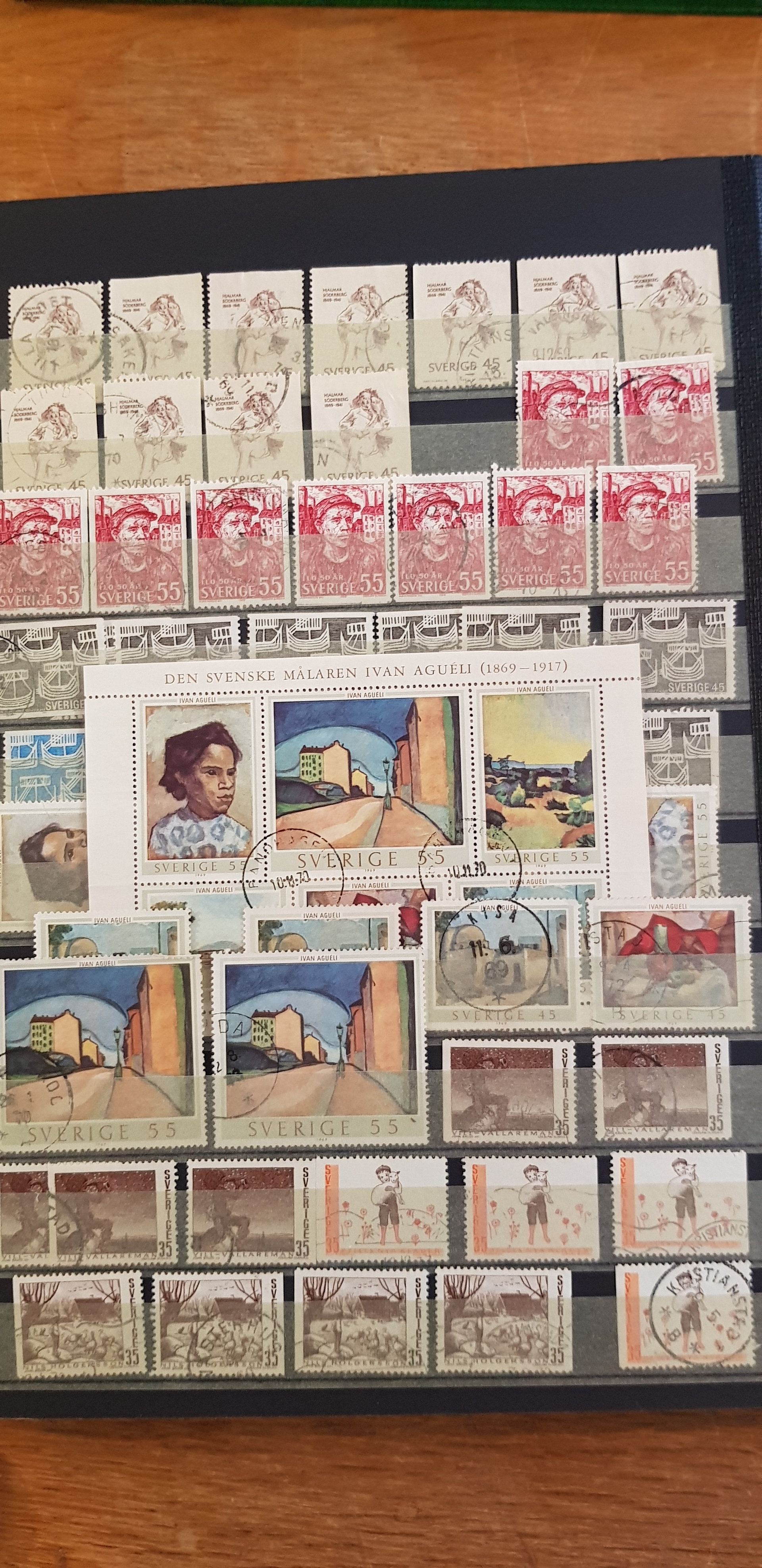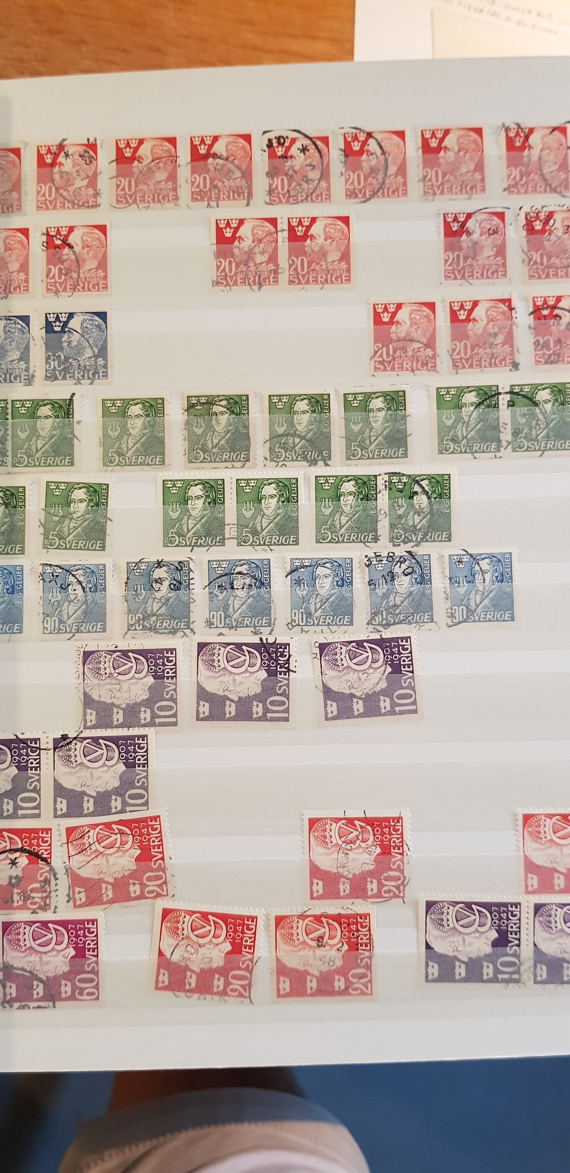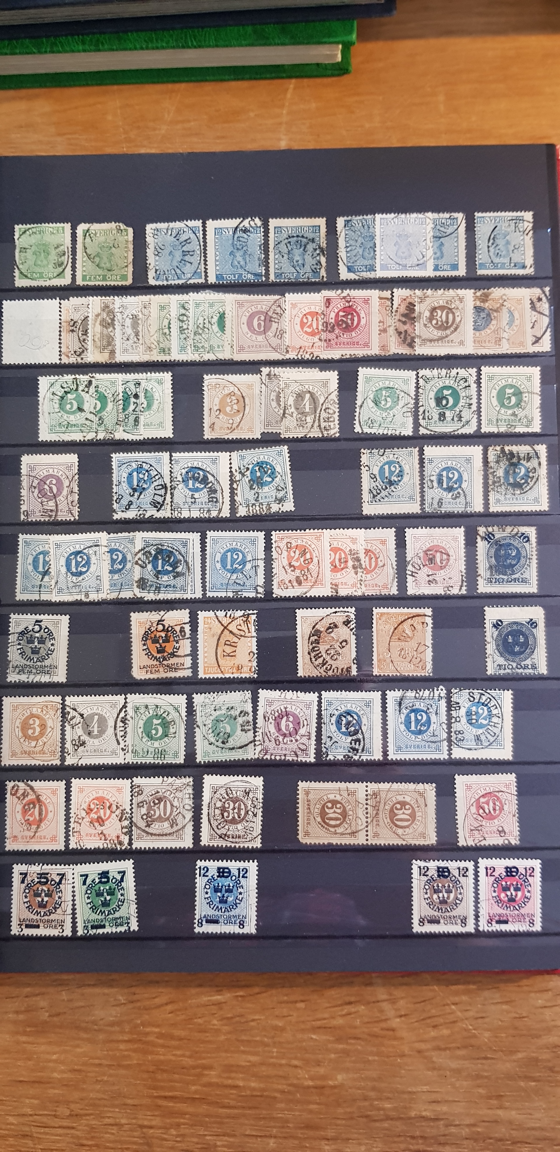 Sweden. Collection/accumulation used 1800s–1900s in box. One album which contains of Coat-Arms, Oscar II and so on. The second album contains of GV mainly. The third album are mainly stamps from the 1960s. In the fourth album 1940s–50s are represented and finally the fifth album contains Three Crowns from 1939–1969. Please see a selection of scans at www.philea.se. Good quality. (>2000)