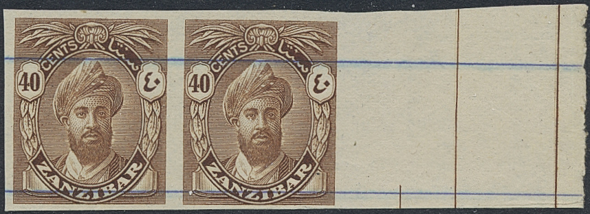 Zanzibar. (★), 1936 De La Rue plate proof of 40 c imperf. in pair on thin blue lined paper. Scarce.  140