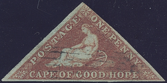 South Africa, Cape of Good Hope. Michel 1 Ixa or SG 3 used, 1853 Allegory 1 d brick-red on slightly blued paper. Near cut on right side. EUR 300