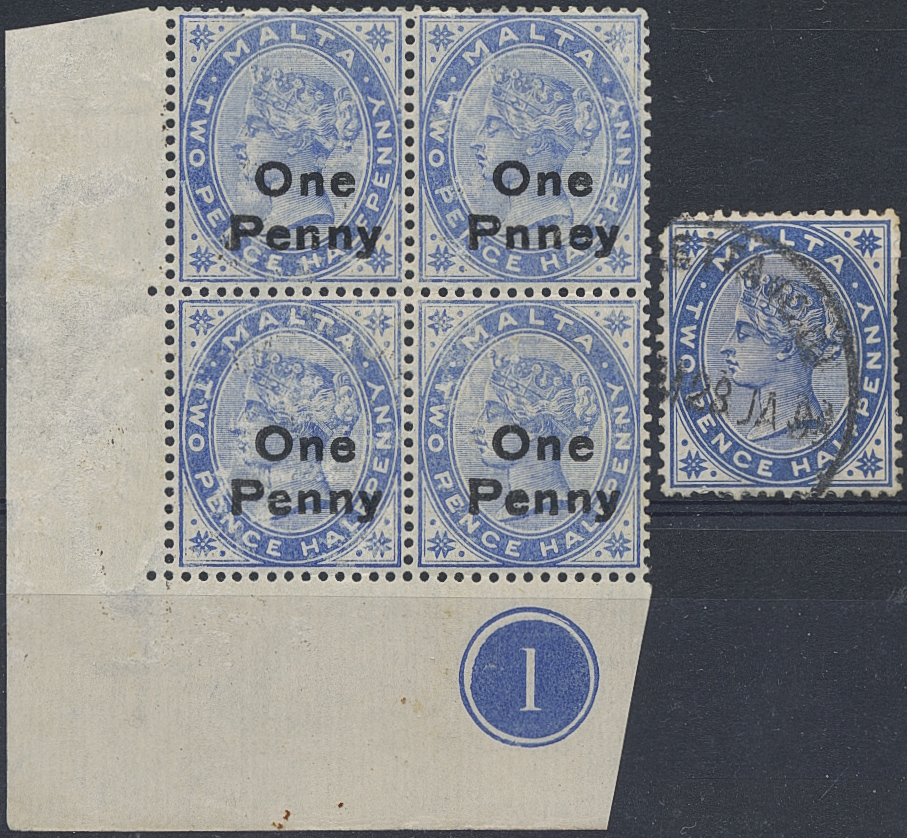Malta. Michel 16 I ★★, 1902 New value overprint 1 / 2½ d pale blue with Pnney instead of Penny variety. Block of 4 with lower left sheet margin.