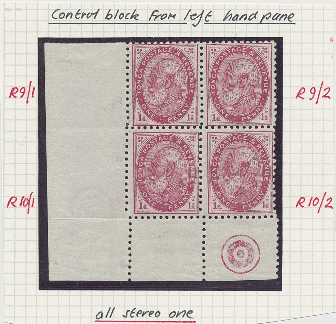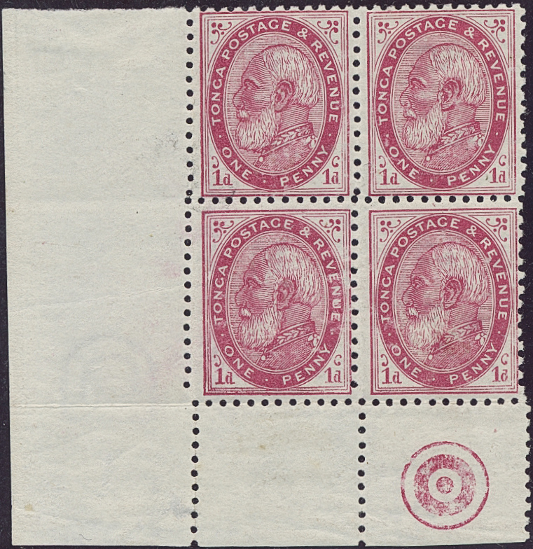 Tonga. SG 1b ★★/★, 1886 1d perf 12 x 11½ block of 4 with bottom left corner sheet margin with shifted bottom row. Three stamps **.