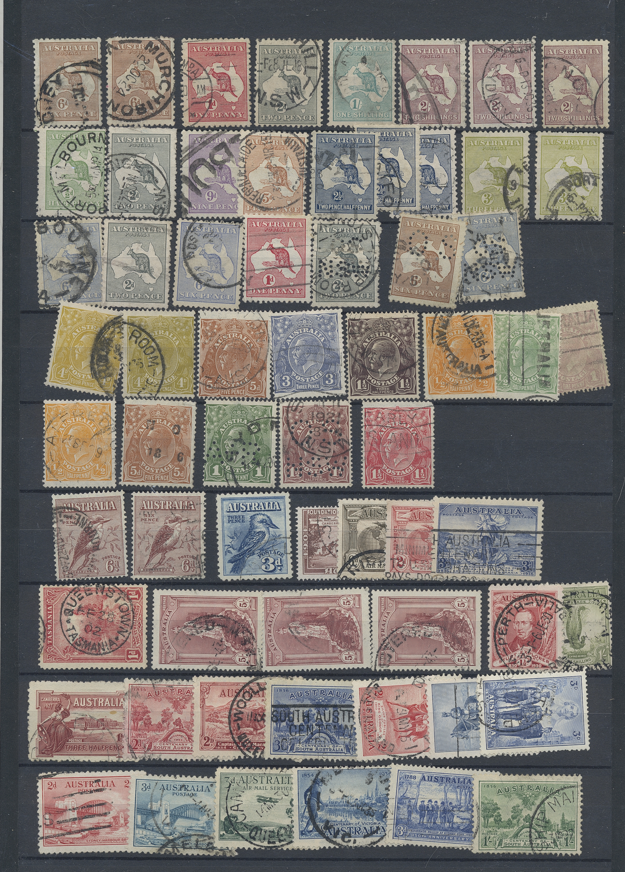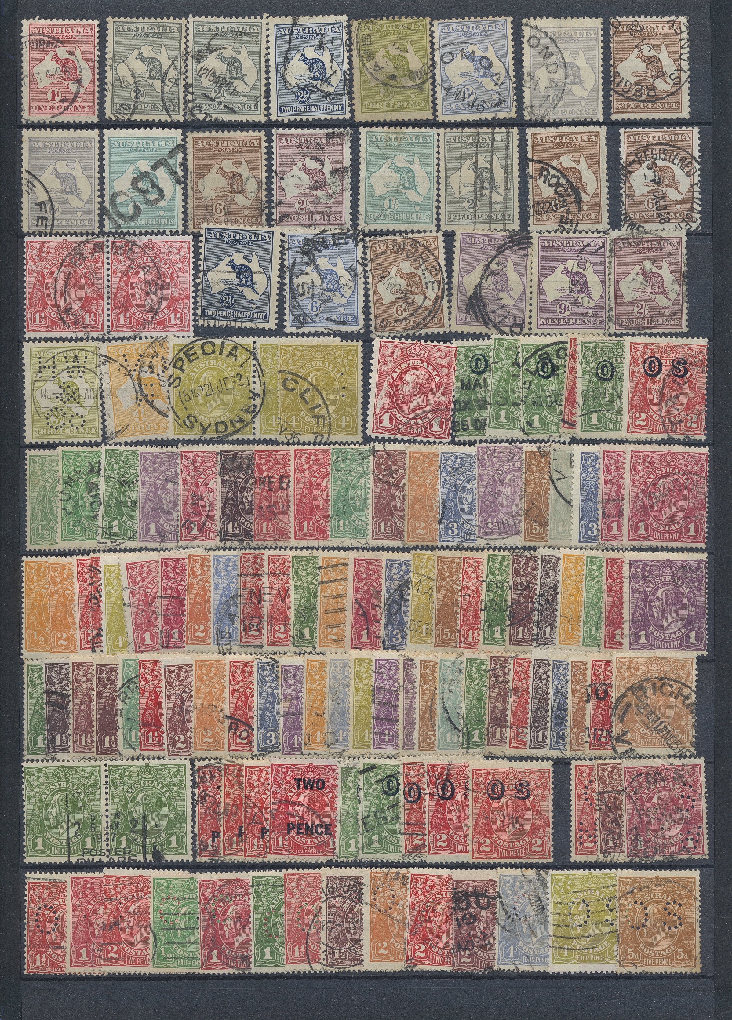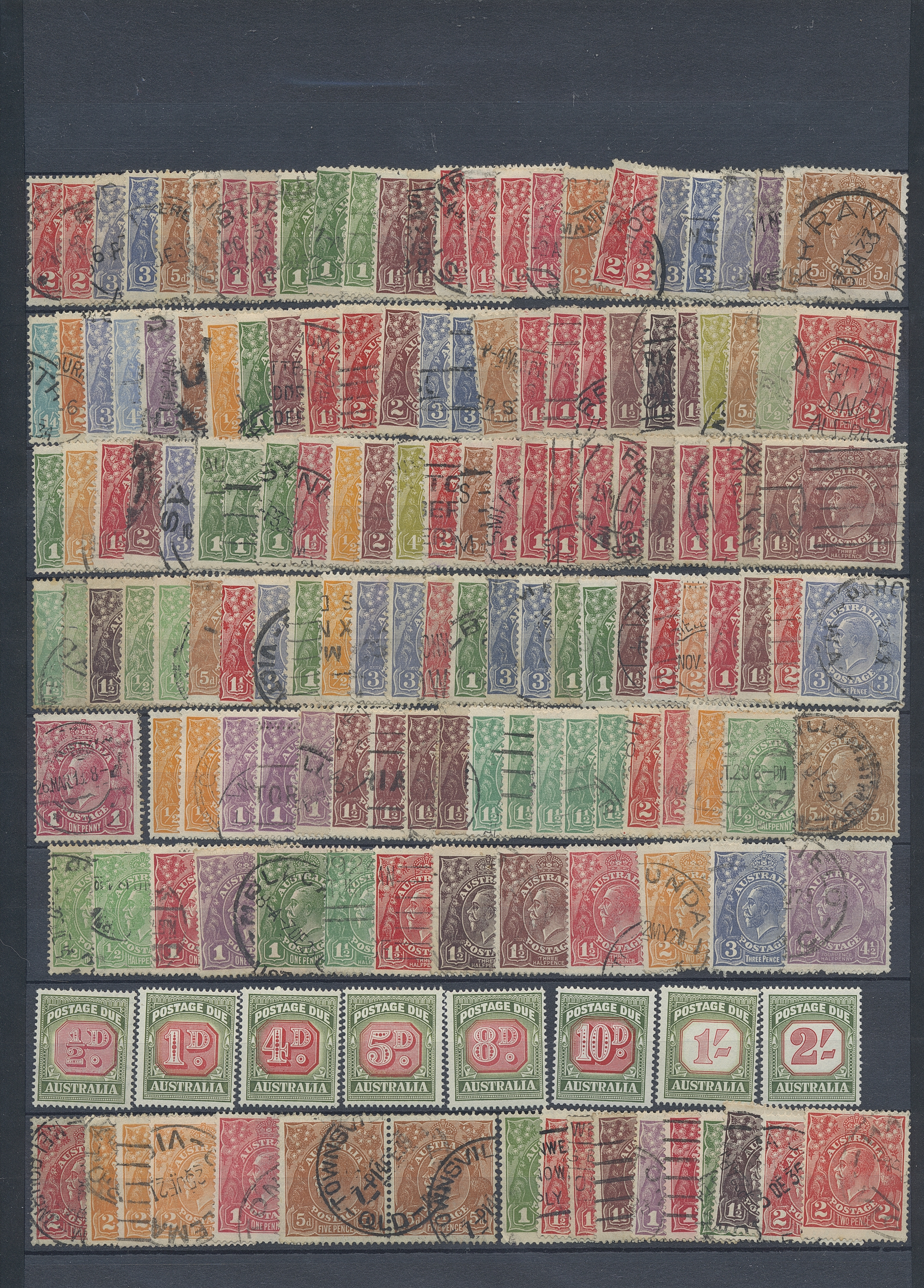Australia. Accumulation used 1880s–1990s. Duplicate compilation on six stockbook pages, 1913-1930s in vast majority. Some Queensland and NSW appear. Incl are also a collection Postage due on two album pages. The entire lot is presented at www.philea.se. (approx. 500)
