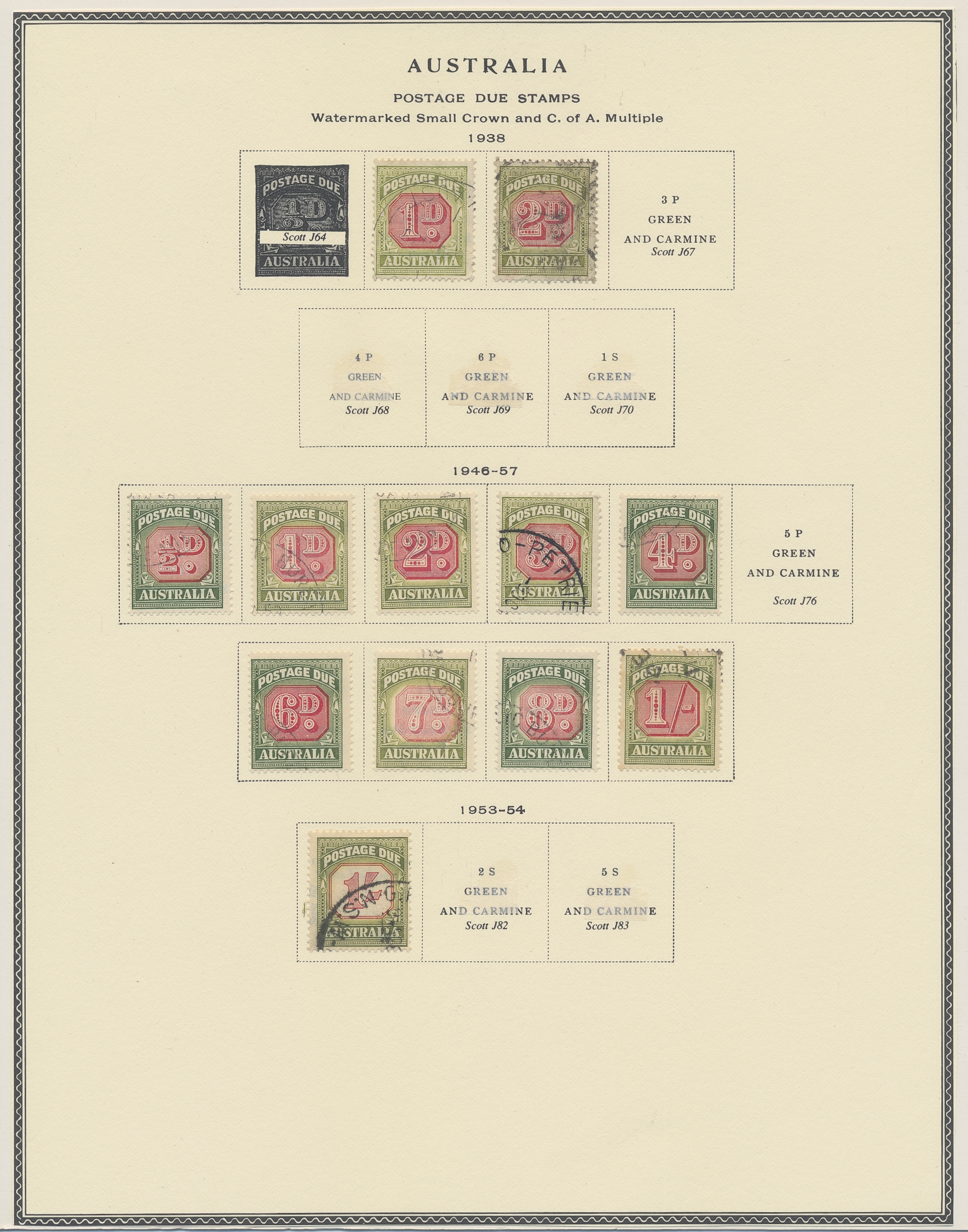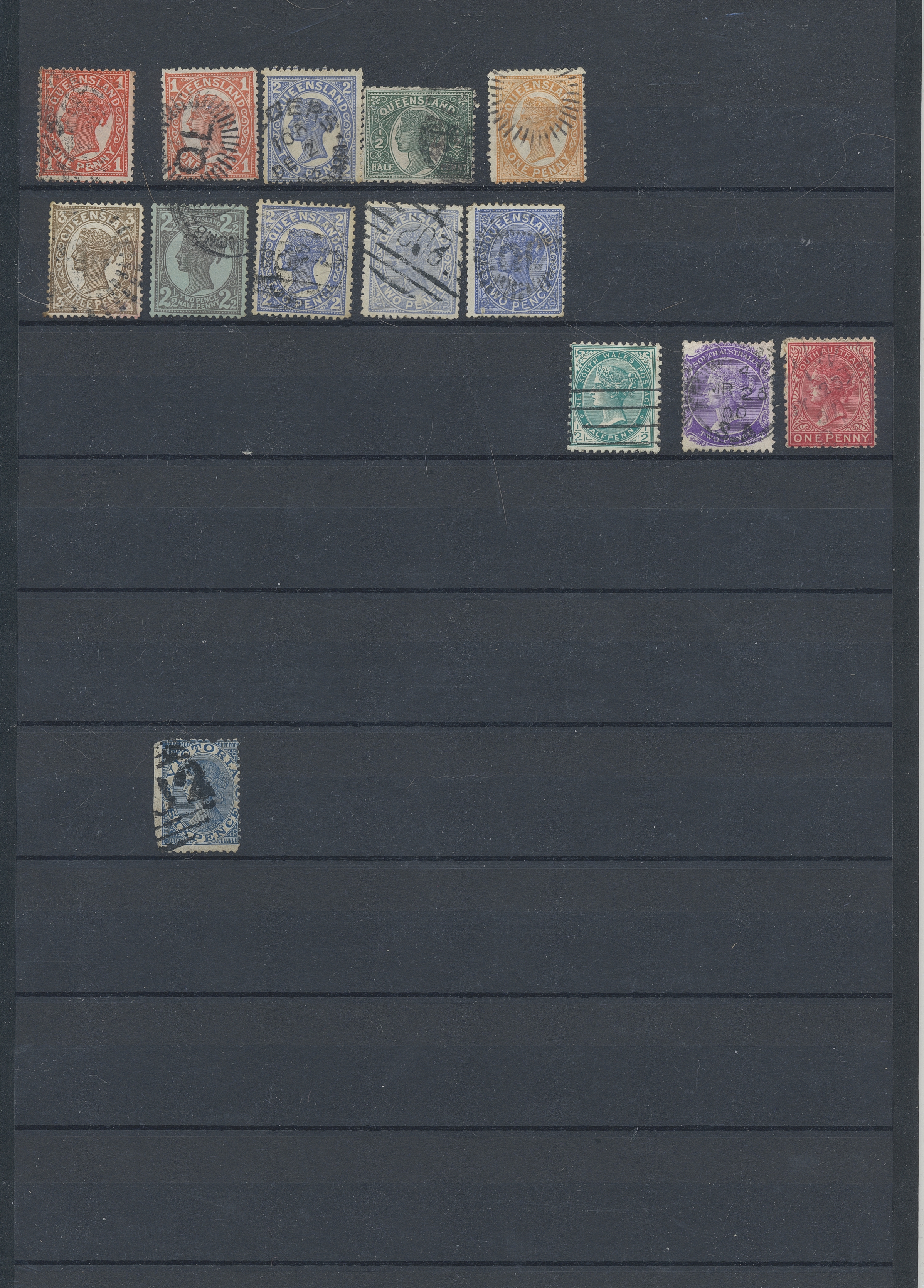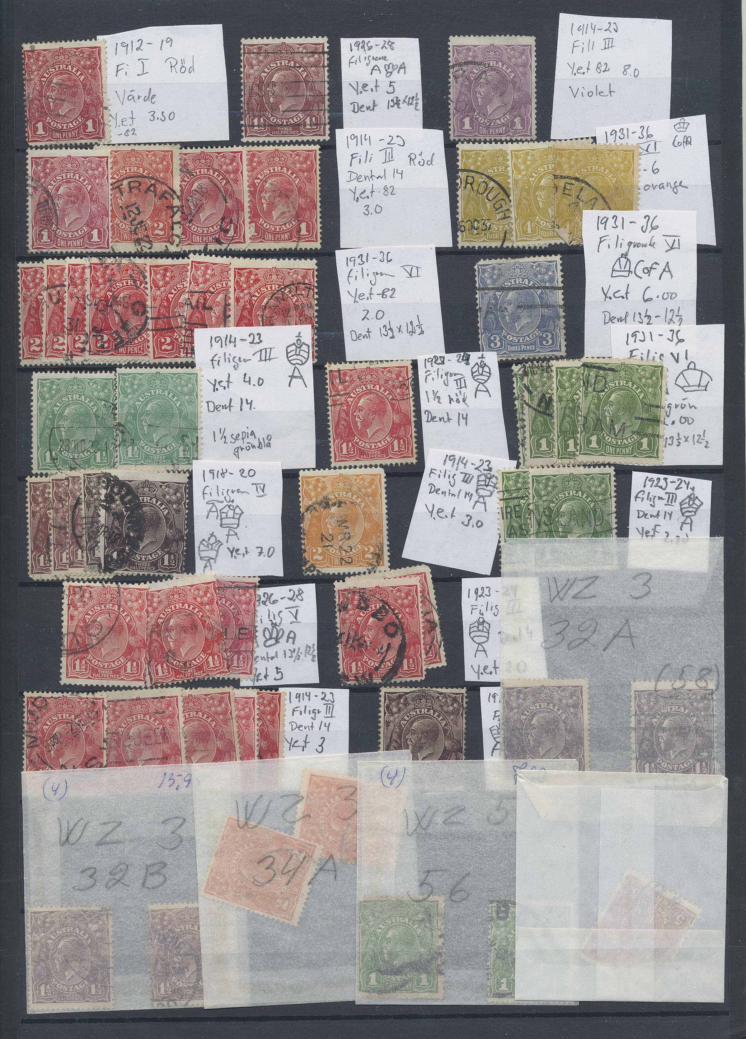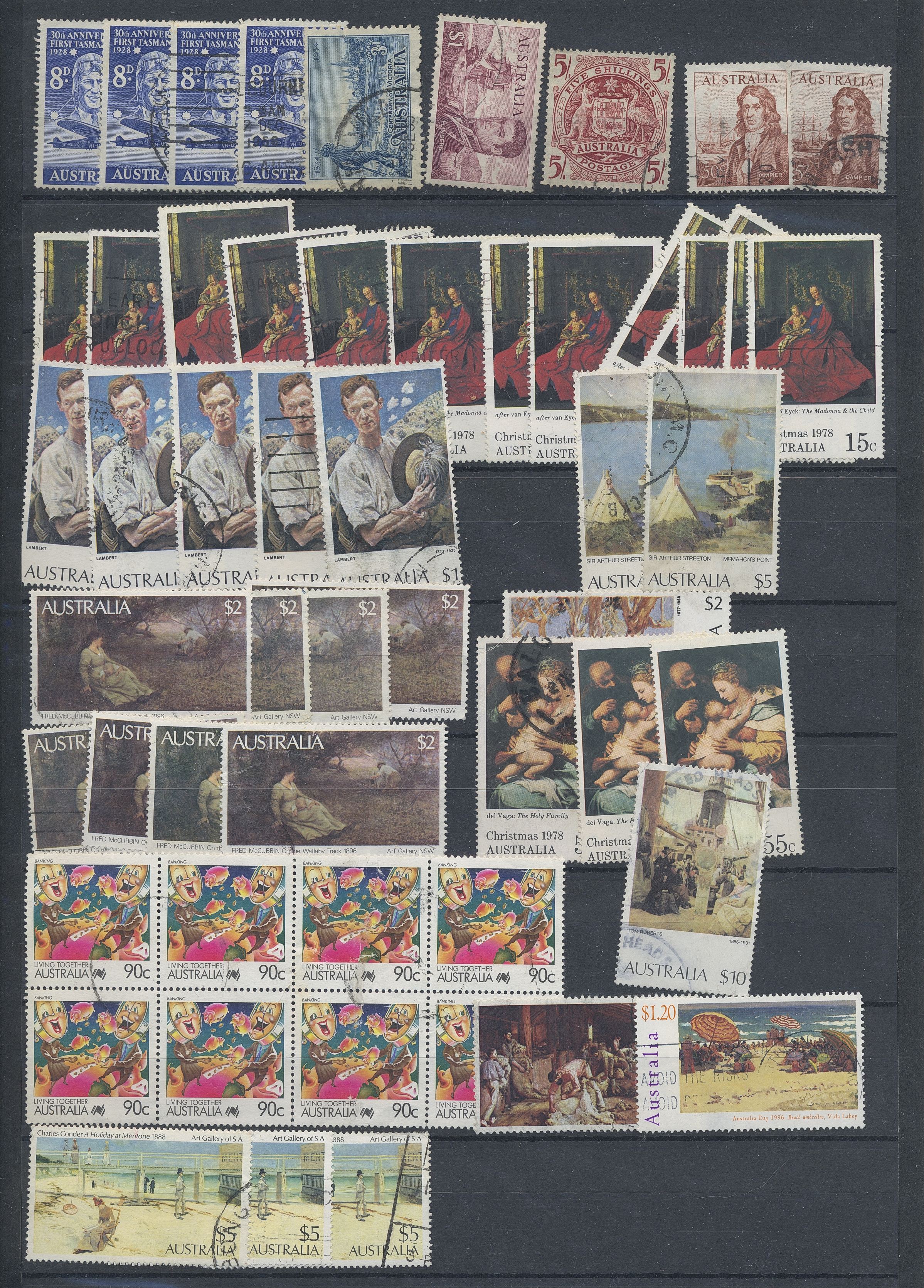 Australia. Accumulation used 1880s–1990s. Duplicate compilation on six stockbook pages, 1913-1930s in vast majority. Some Queensland and NSW appear. Incl are also a collection Postage due on two album pages. The entire lot is presented at www.philea.se. (approx. 500)