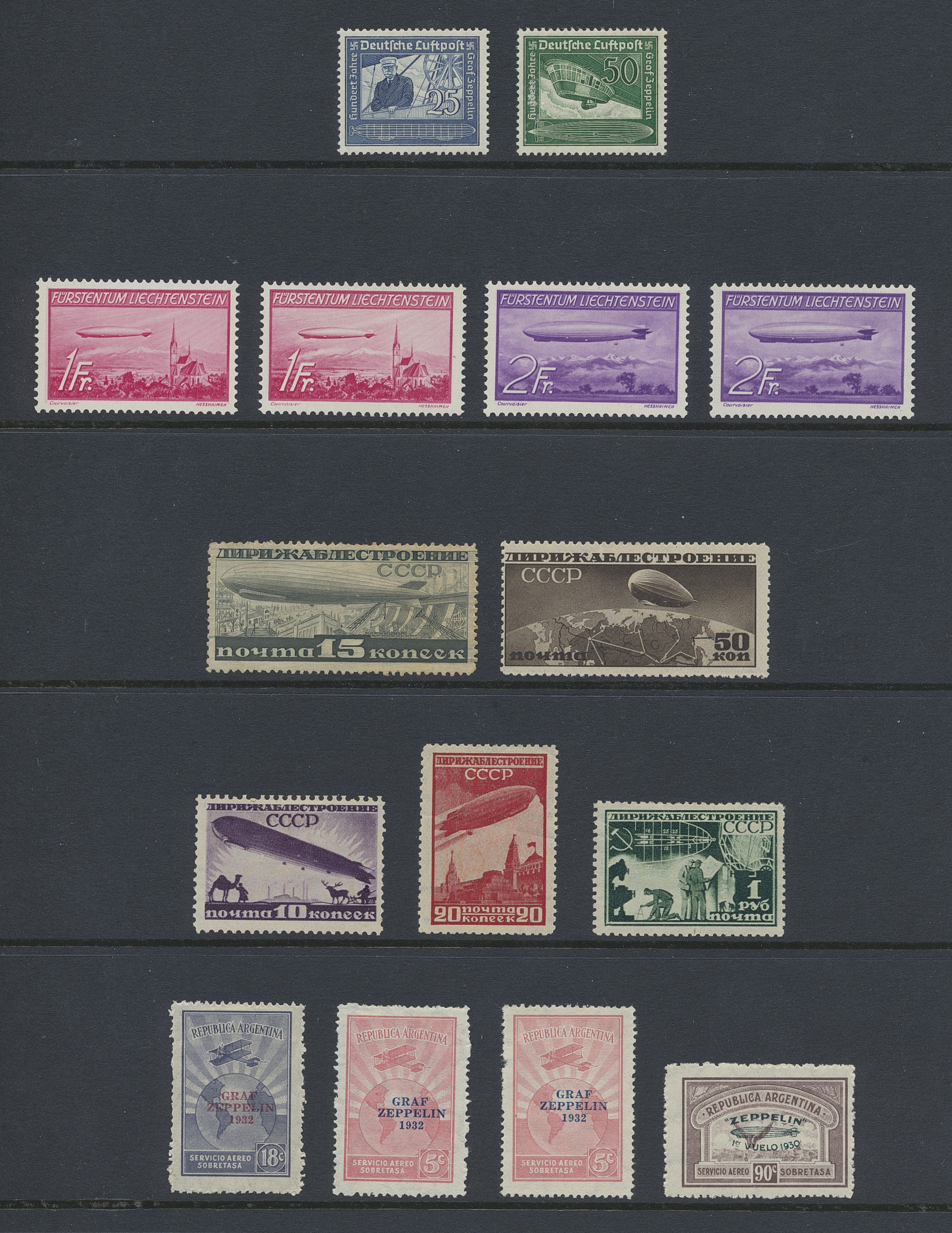 Thematics, Zeppelin. Lot ★★/★ 1931–1938. Fifteen Mint stamps from Germany (MNH), Liechtenstein, Russia (20k crease) and Argentina (90c signed). The entire lot is presented at www.philea.se. (15)