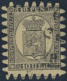 Finland. Facit 7 used, 1866 Coat-of-Arms Finnish values 10 p black on yellow paper. One perf. minor short. SEK 2500