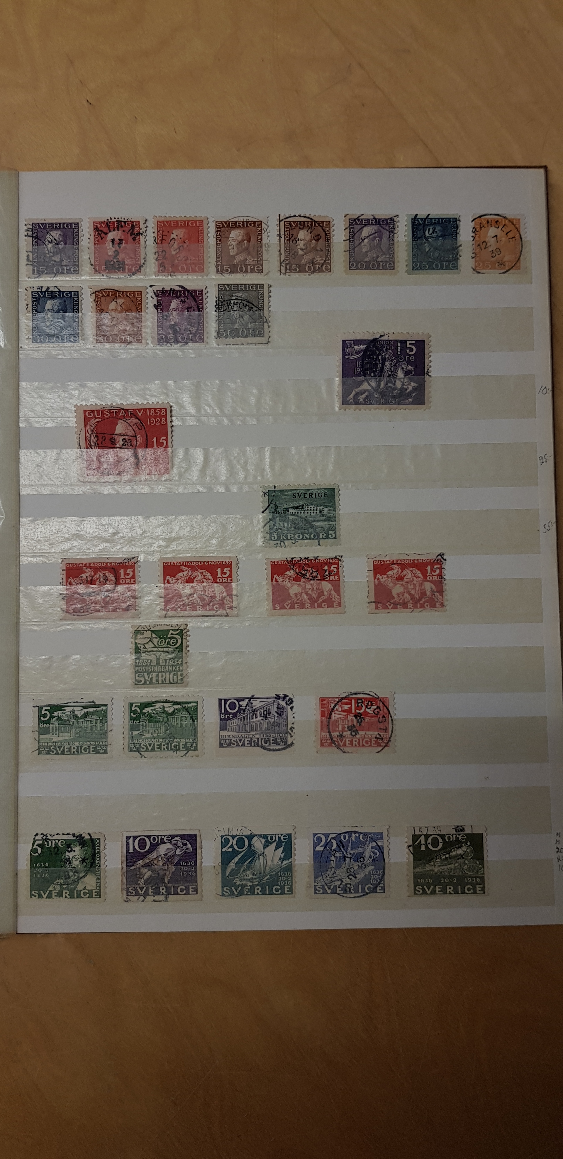 Sweden. Collection/accumulation mostly used 1900s in box. Three albums with Swedish stamps used and unused, FDCs and envelopes. Also plastic envelopes with stamps. Please see a selection of scans at www.philea.se. Mostly fine quality. (>500)