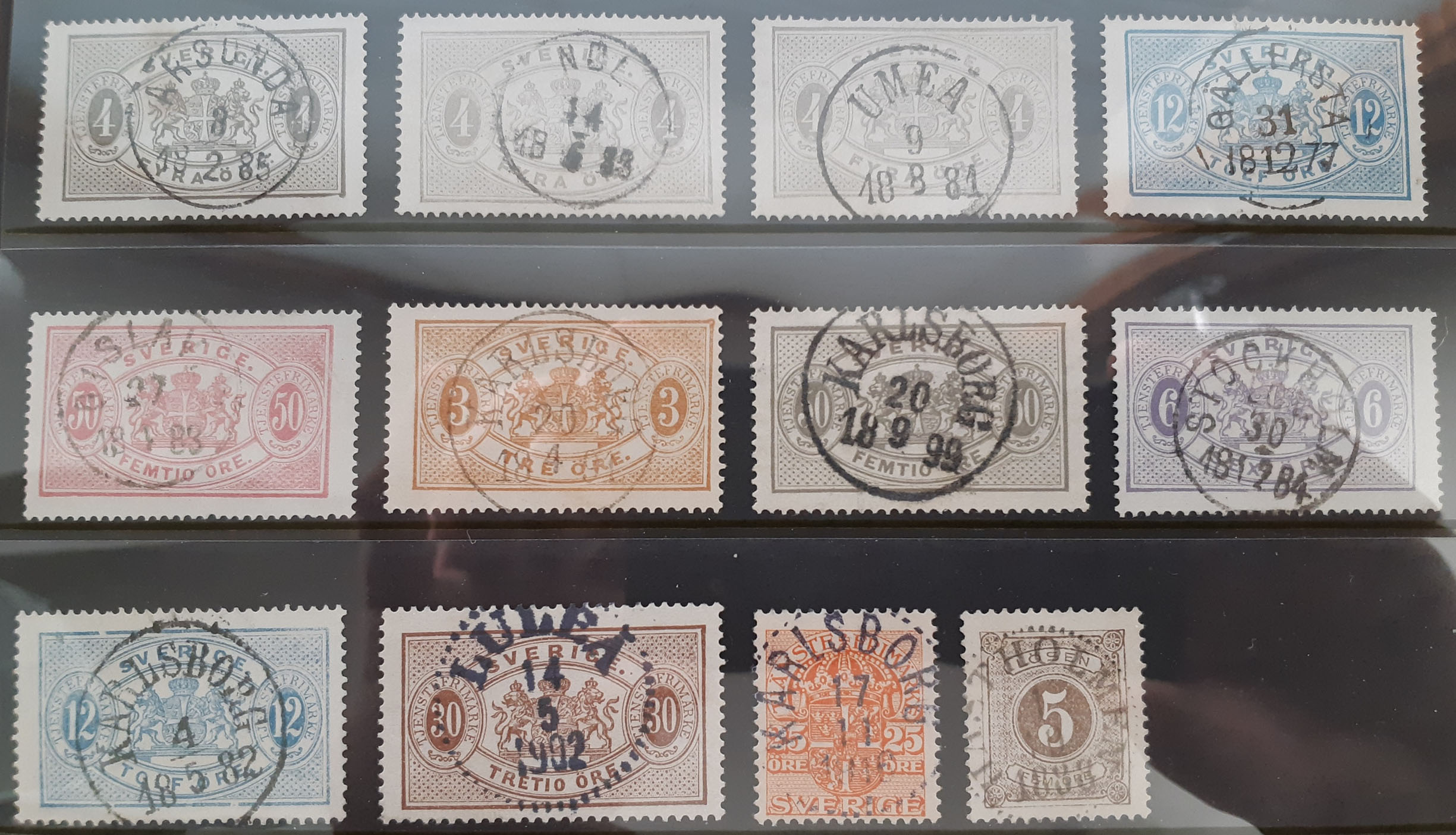 Sweden. Lot used OFFICIALS. Selected stamps with mostly EXCELLENT cancellations, incl. e.g. 3×4 öre perf. 14. Also one postage due stamp. Mostly good quality. (12)
