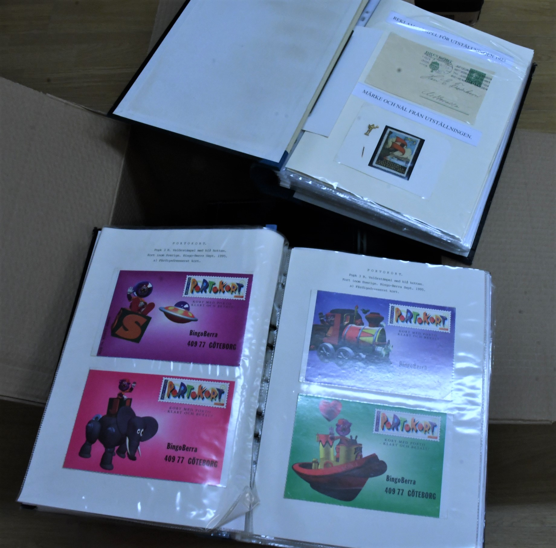 Sweden. Picture postcards, collection/accumulation 1940s–1990s. Topographical in two large photo albums, modern cards in vast majority. About six hundred in total, several related to Gothenburg. One binder with PORTOKORT (e.g. a collection "BingoBerra") and one binder with more Gothenburg-related material, e.g. the 1923 exhibition. A selection of scans are presented at www.philea.se. Approx. 9 kg. (approx 800)
