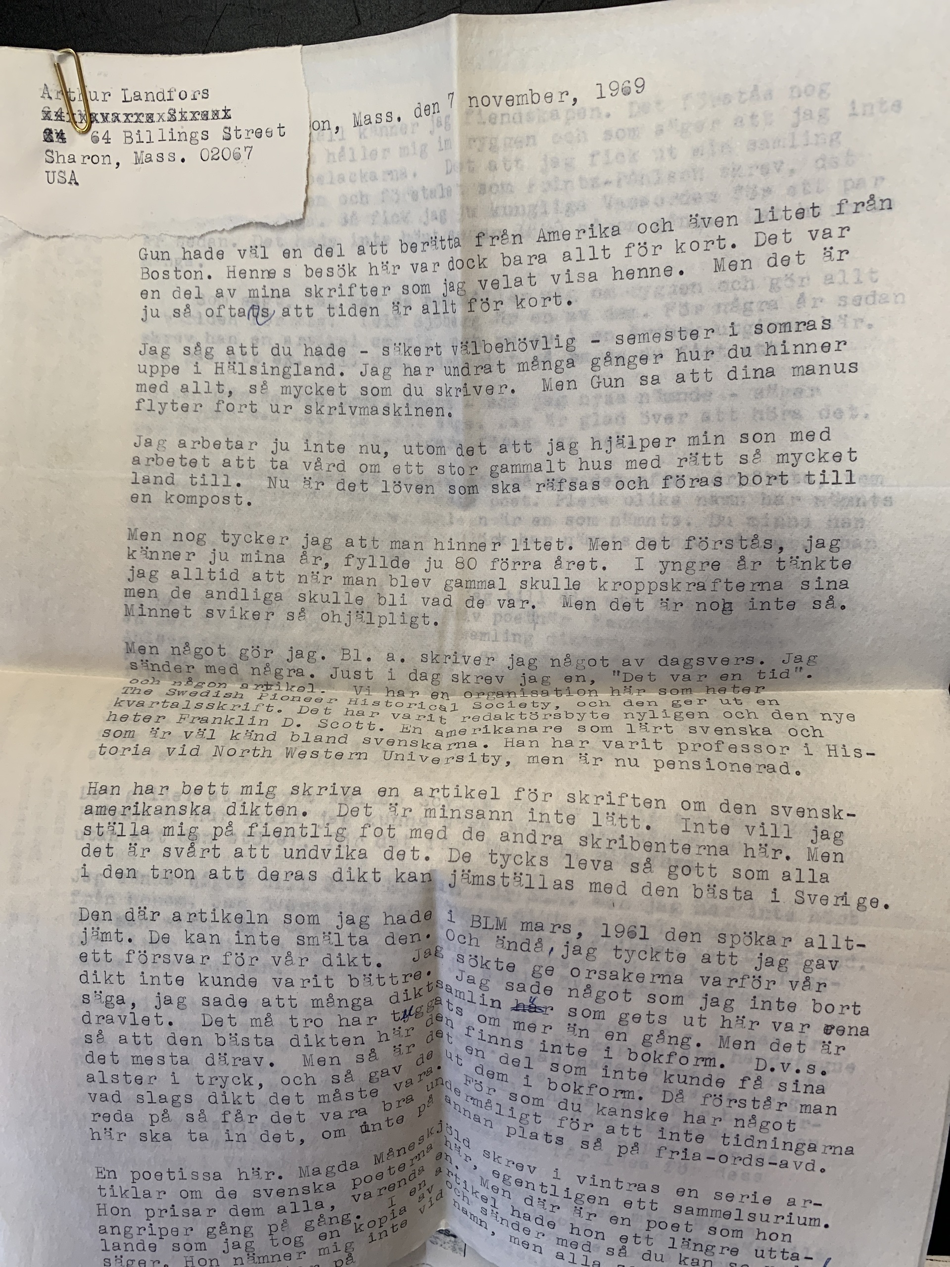 Famous people, covers etc. More than 10 letters from the Swedish-American author "Norrbottensförfattare" ARTUR LANDFORS (1888-1973) to the editor of "FIBs Lyrikklubb Stig Carlson. Please see a selection of scans at www.philea.se.