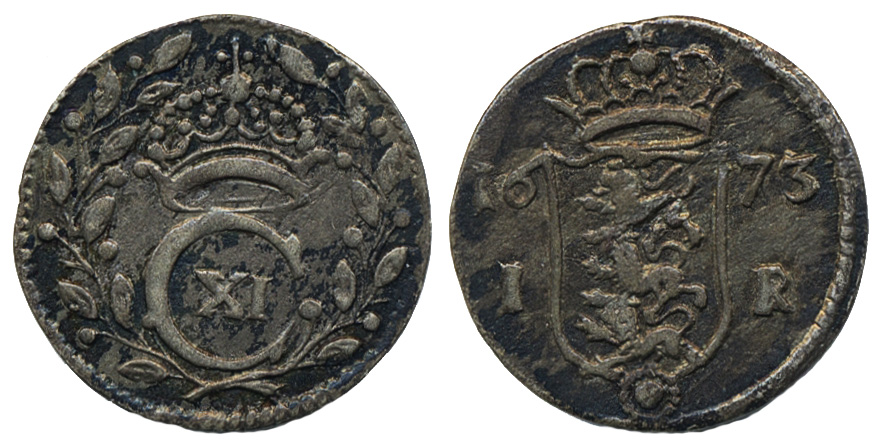 Coins, Swedish possessions, Reval. Karl XI, SB 136, 1 öre 1673. 1.08 g. Attractive, well struck example. SMB 1029. 1+.