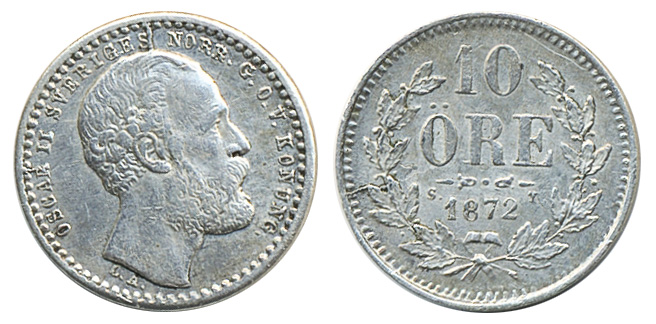Coins, Sweden. Oskar II, MIS 1a, 10 öre 1872. SMB 2. 1+.