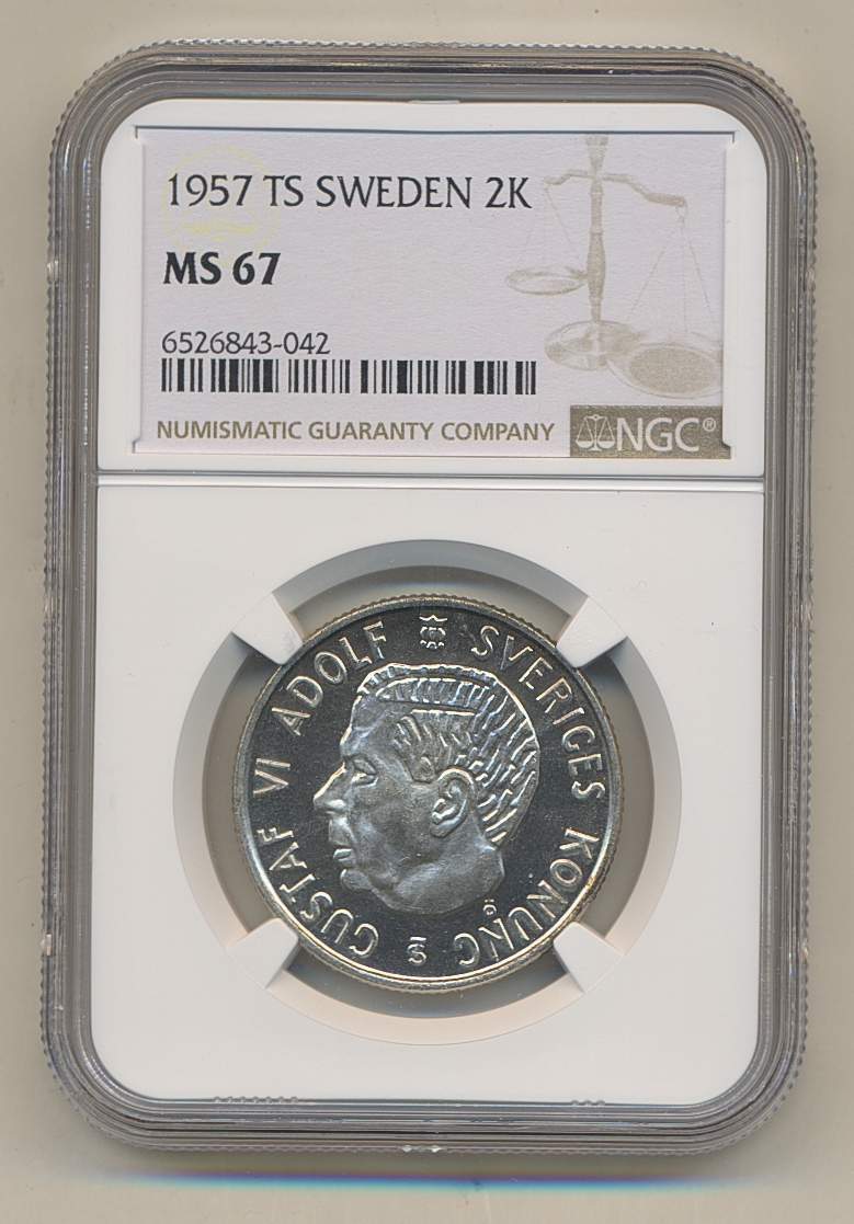 Coins, Sweden. Gustav VI Adolf, MIS I.6, 2 kronor 1957. Superb example, from specimen set. Graded by NGC as MS67. SM 16. 0.