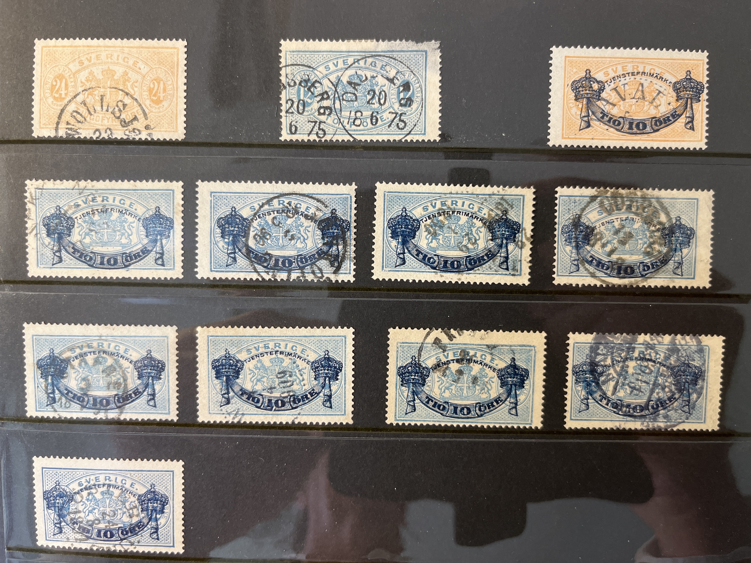 Sweden. Accumulation used on ten visir leaves. Official stamps, large size and postage due stamps. Mixed quality.