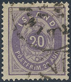 Iceland. Facit 14 used, 1876 Aur values 20 aur violet, perf 14 × 13½. SEK 4400