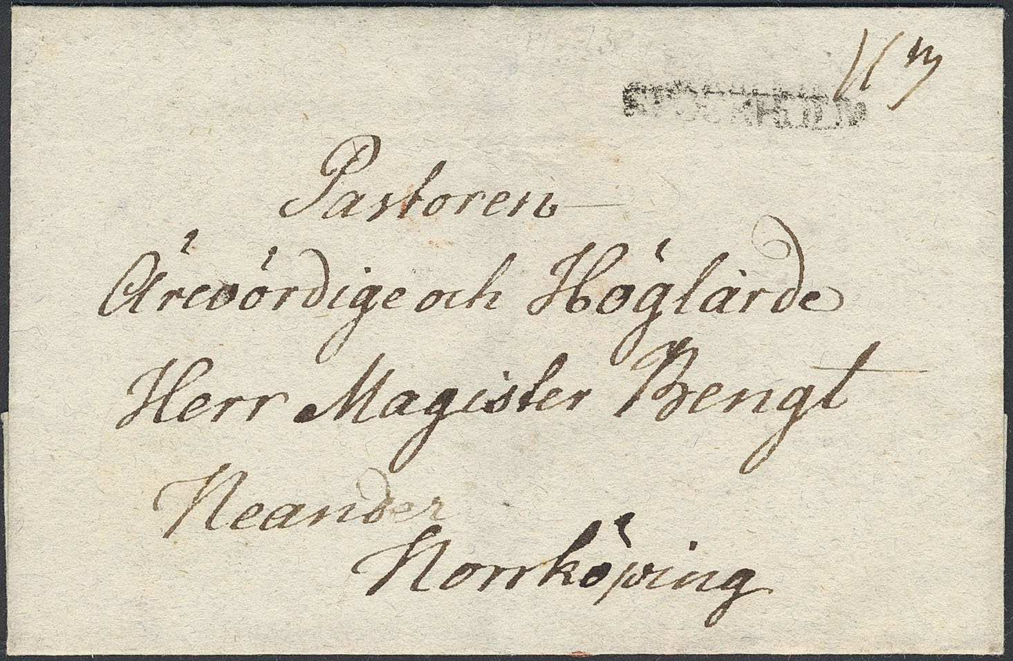 Sweden. A county. STOCKHOLM, straight postmark. Type 5 on beautiful cover sent to Norrköping. Postal: 3500:-