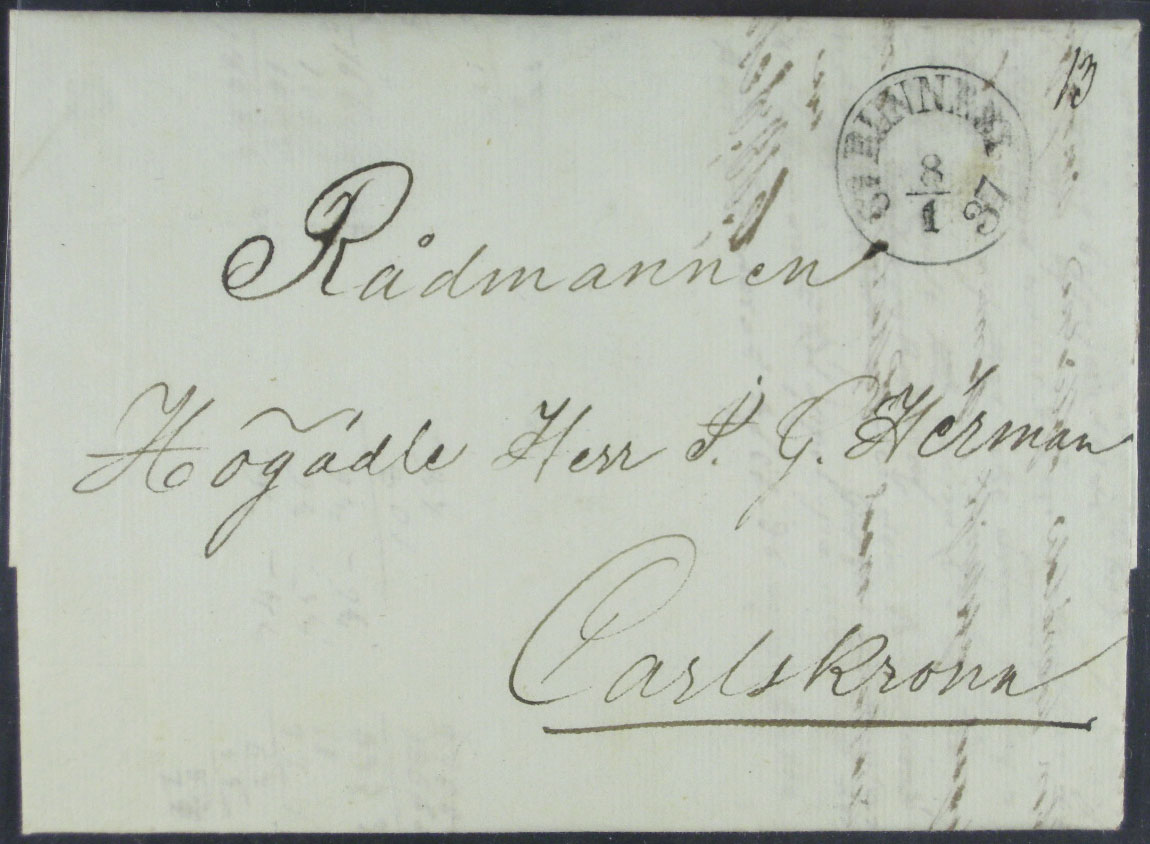 Sweden. K county. RUNNEBY 8.1.1837, arc postmark. Type 2 on letter sent to Karlskrona. Superb. Postal: 6000:-