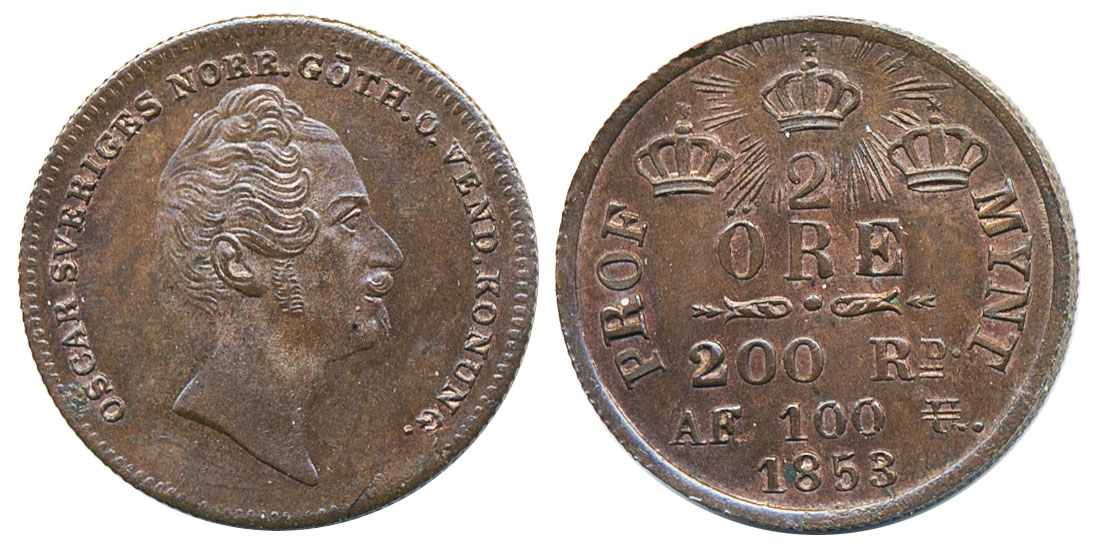 Coins, Sweden. Oskar I, SM 167b, 2 öre 1853 R. 4.17 g. Pattern coin. Milled edge. Small insignificant planchet flaw. An exceptional example with mirror-like patina and lustre. 01/Good 01.