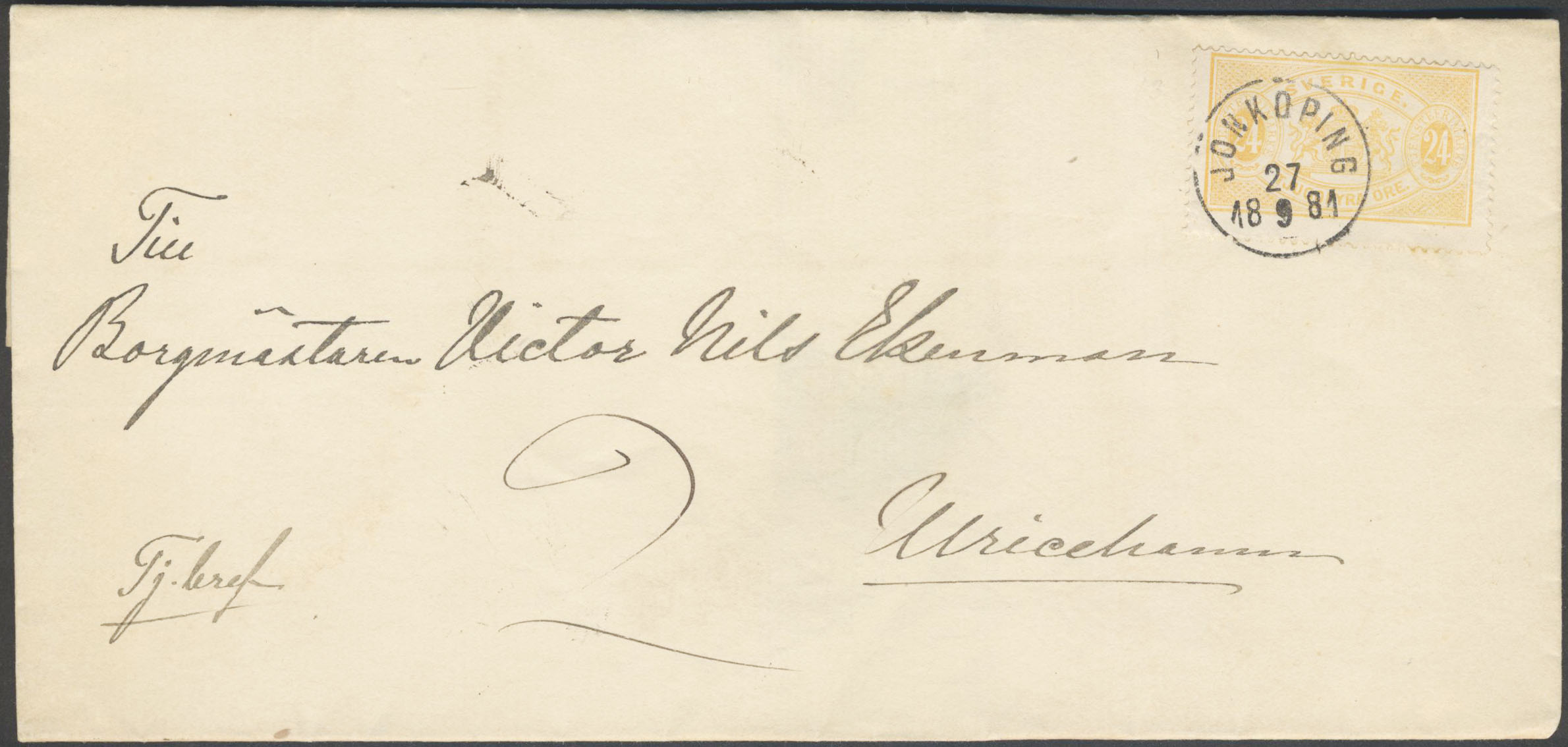 Sweden. Official Facit Tj20 on cover, 24 öre yellow, perf 13 on beautiful 2-fold cover sent from JÖNKÖPING 27.9.1881 to Ulricehamn.