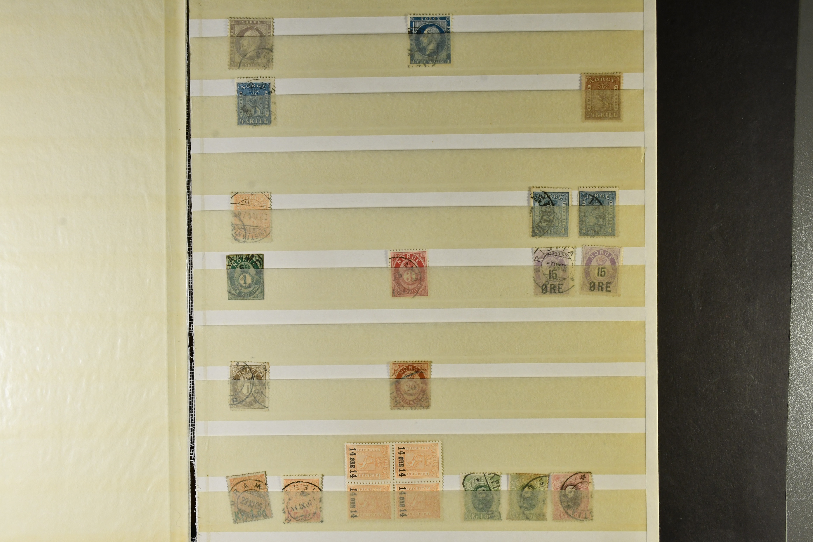 Norway. Collection/accumulation ★★/★/⊙ 1856–1990 in box. Three stockbooks and a number of album leaves. In one of the stockbooks (with cancelled stamps) 8 skilling denominations. In one of the stockbooks only officials. On the album leaves mostly MNH material. Somewhat mixed quality. Approx. 5 kg. (1000s)