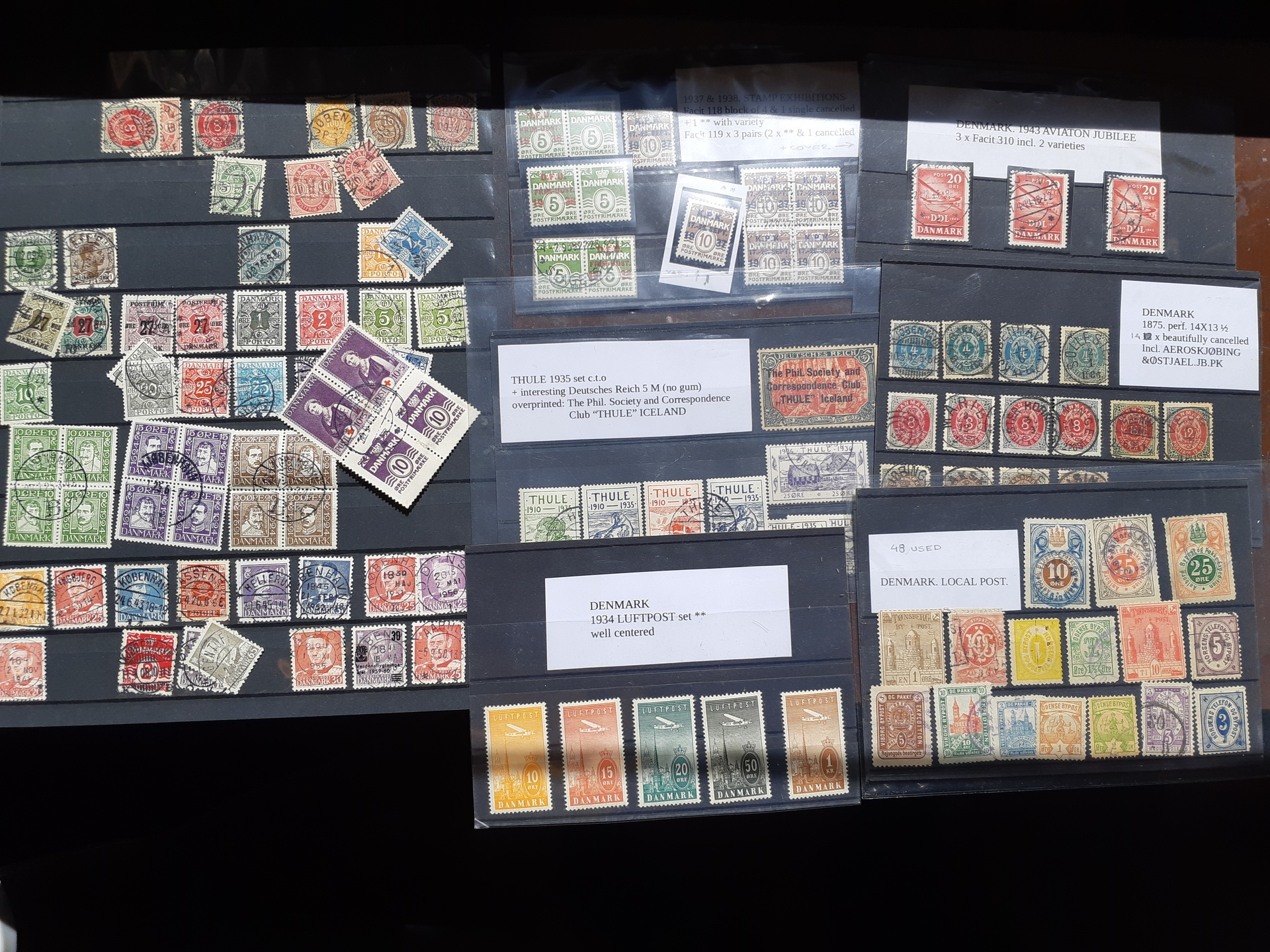 Denmark. Collection used 1870s–1950s on leaves. Duplicates incl. cancellations, varities, back of the book material, etc. Mostly good quality. (700)