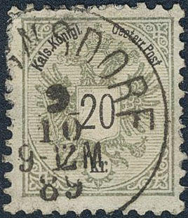 Austria. Michel 48D used, 1883 Double Eagle 20 Kr grey/black perf 10½. EUR 400