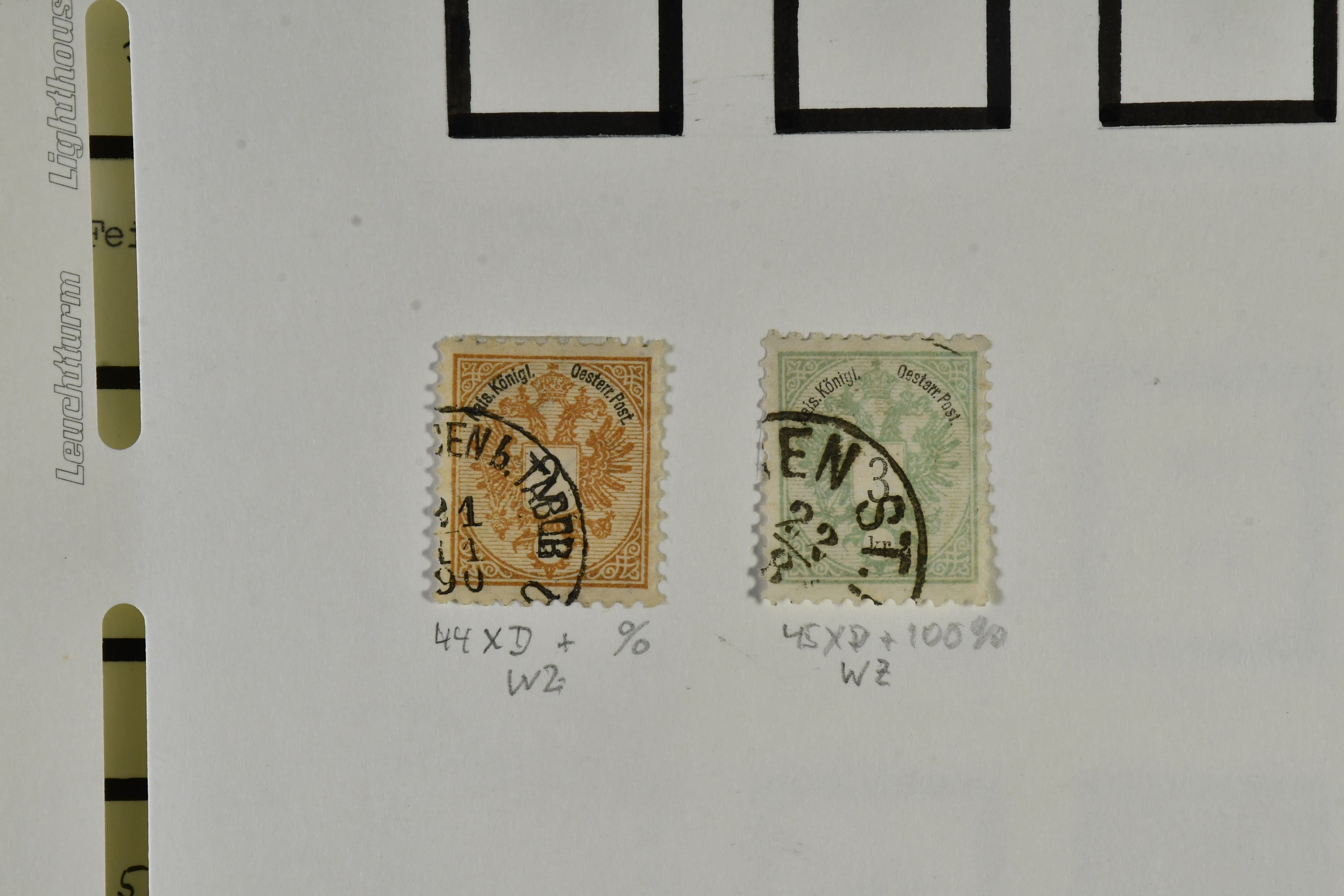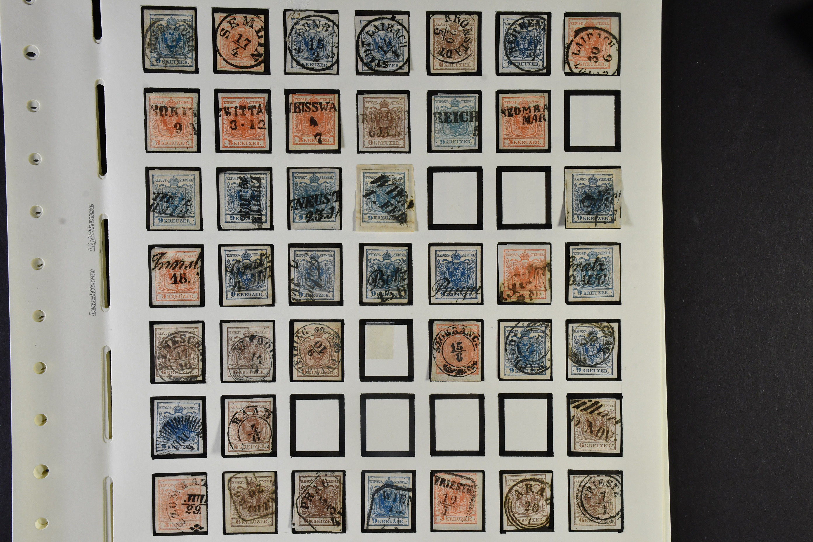 Austria. Collection used 1850's1883 on 16 home made leaves. CANCELLATIONS, very interesting study various issue s in the period with e.g. blue and red cancellations, many nice town cancellations etc. The entire lot is presented at www.philea.se. Fine quality.