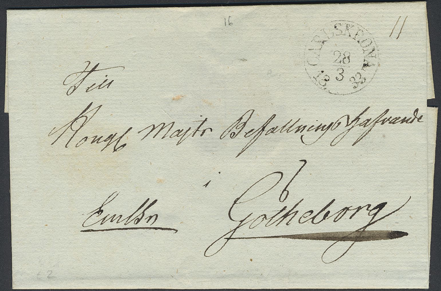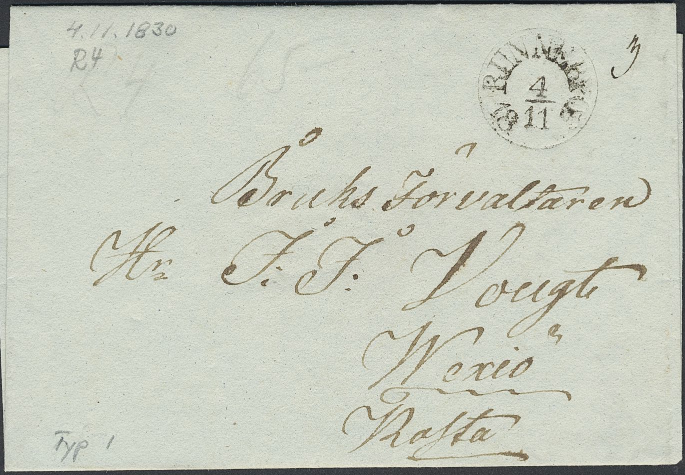 Sweden. Prephilately, collection K COUNTY on visir leaves. Selected better items: Arc pmks CARLSCRONA type 2, CARLSCRONA type 4 in two copies, CARLSHAMN type 1 in four copies (P: 800 each), RUNNEBY type 1 in three copies (P: 1200 each), rectangular pmks CARLSKRONA type 1 in three copies, type 2 (P: 600), type 3 in two copies (P: 1000 each) and type 6 in four copies, and SÖLFVITSBORG type 1 in two copies (P: 800 each). The entire lot is presented at www.philea.se. Fine–superb quality. (22)