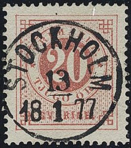Sweden. Facit 22g used, 20 öre dull red. EXCELLENT cancellation STOCKHOLM 13.1.1877. Signed O.P.