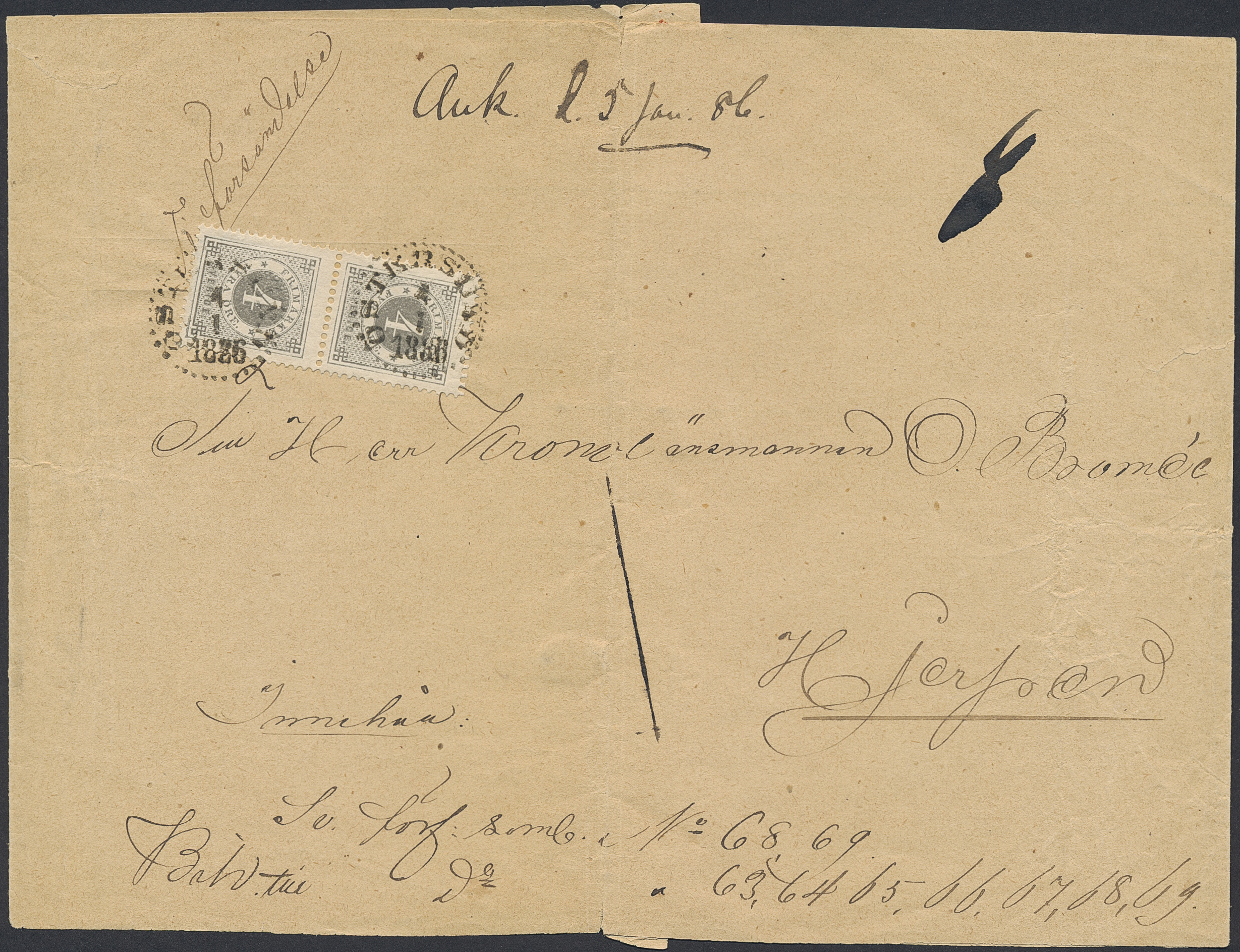 Sweden. Facit 29e on cover, 2×4 öre deep grey-grey on newspaper banner with notation "Tj.försändelse", sent from ÖSTERSUND 4.1.1886 to Hjerpen. Somewhat worn. Scarce.