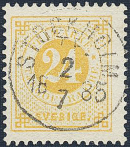 Sweden. Facit 34k used, 24 öre yellow on calendered paper. EXCELLENT cancellation STOCKHOLM T.E. 2.7.1885.