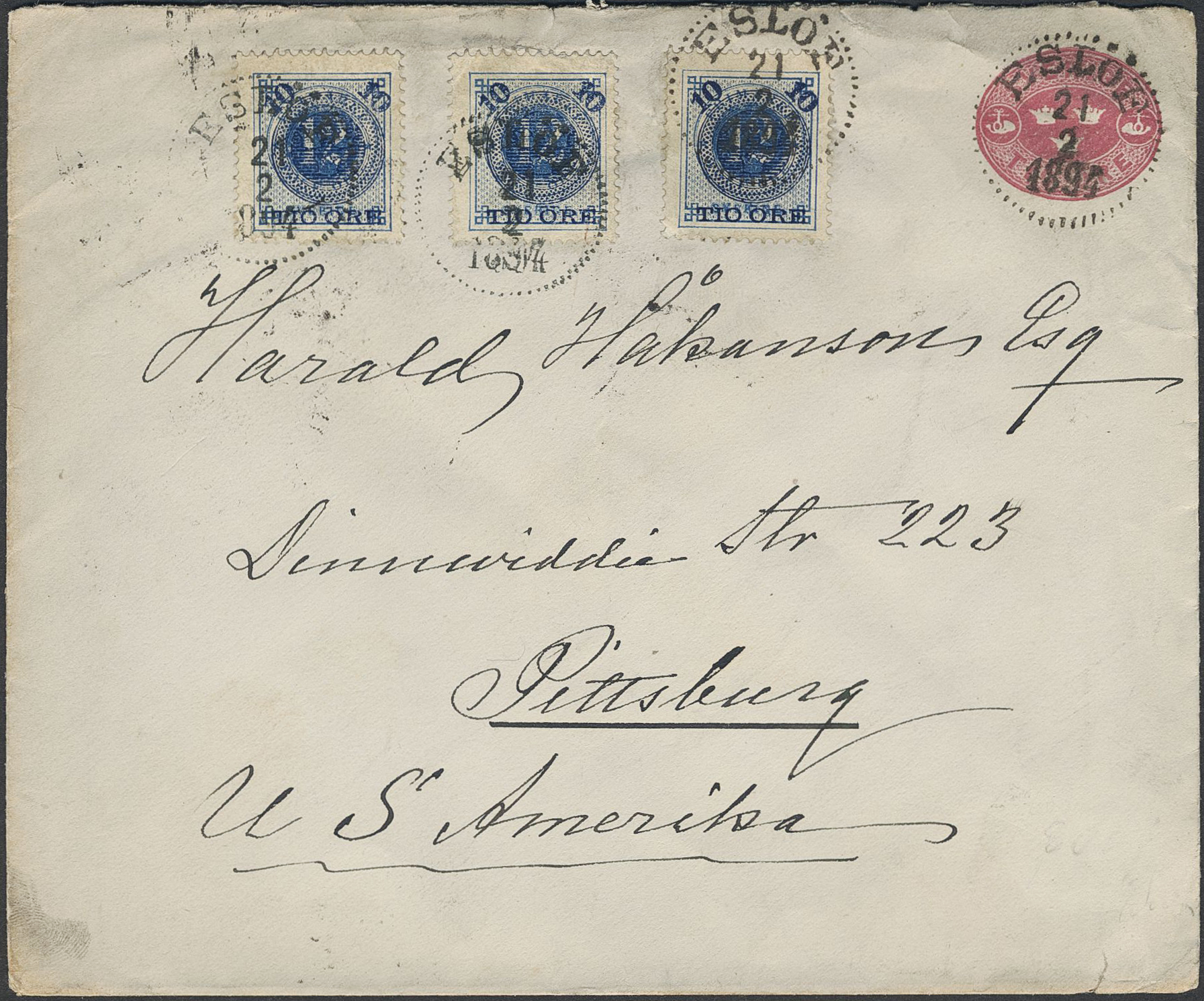 Sweden. Postal stationery, Stamped envelope, Facit Fk6, 50, Stamped envelope 10 öre additionally franked with 3×10/12 öre, sent from ESLÖF 21.2.1894 to USA. Transit NEW YORK and arrival pmk PITTSBURGH, PA. 5.MAR.94.