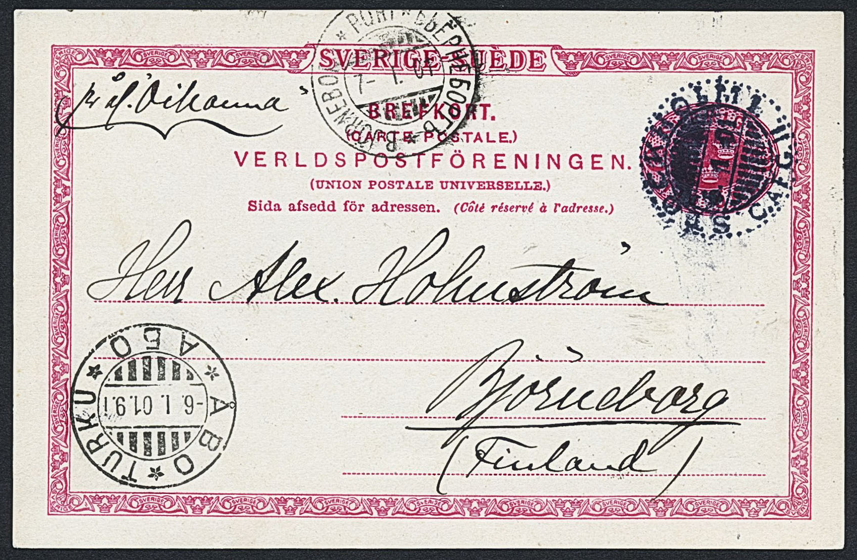 Sweden. Postal stationery, Single postcard, Facit bKe13, Postcard 10 öre, interesting usage sent from STOCKHOLM 6.1.01 to Finland. Ship mail notation "pr åf Oikama". Transit pmk ÅBO TURKU 6.1.01.