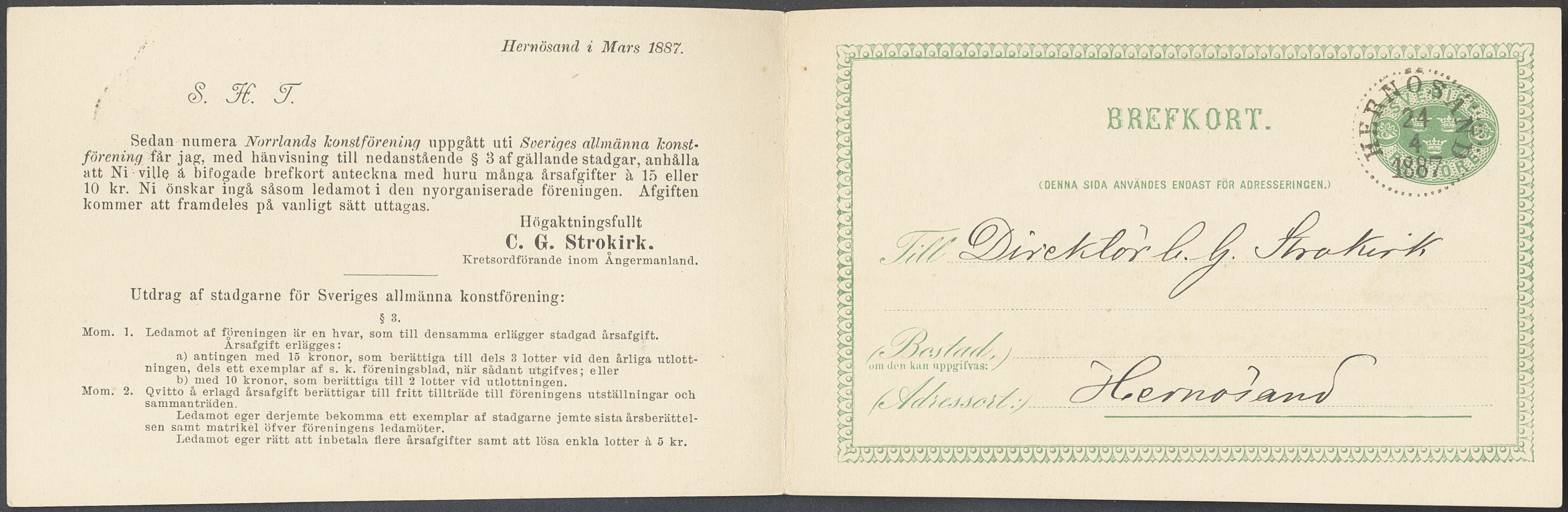 Sweden. Postal stationery, Double postcard, Facit bKd6A+Aa, Reply-paid postcard 5+5 öre sent in both directions, the originating card from HERNÖSAND 16.4.1887 and the response card from HERNÖSAND 24.4.1887. SEK 700