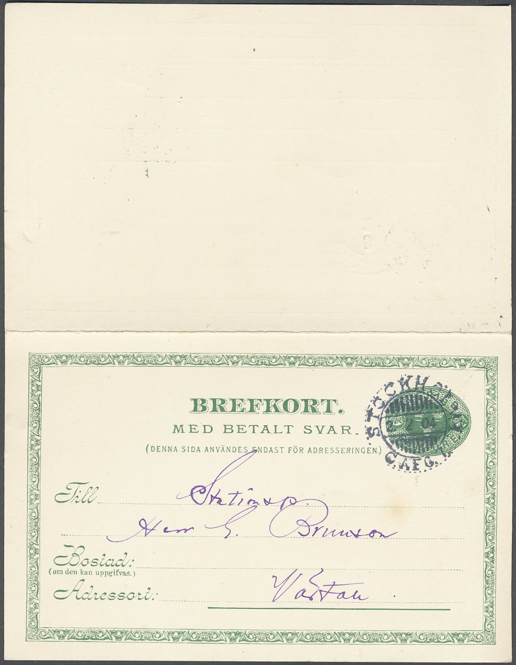 Sweden. Postal stationery, Double postcard, Facit bKd10, Reply card 5+5 öre sent in both directions, the originating card from STOCKHOLM 2.2.04 and the response card from VÄRTAN 3.2.1904. Small imperfections.