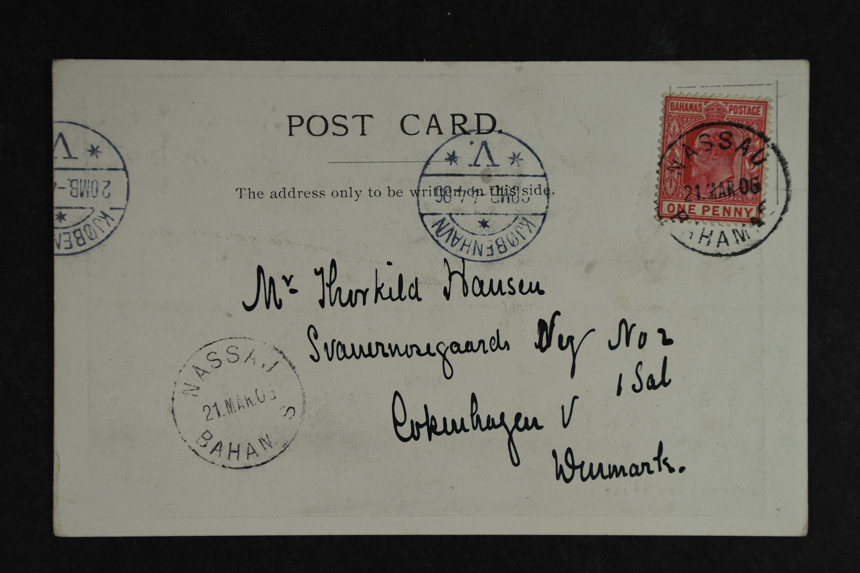 Bahamas. Michel 23 on cover, 1902 King Edward VII 1 d red on post card NASSAU 21 MAR 06 sent to Denmark with arrival cds.