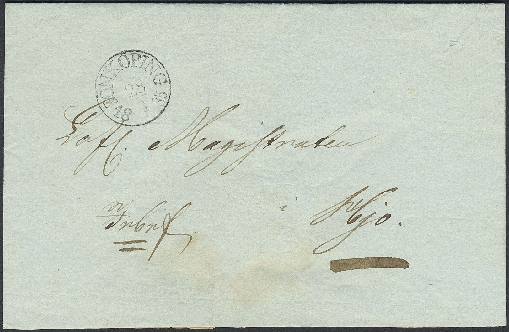 Sweden. Prephilately, collection F COUNTY on visir leave. Selected better items: Arc pmks HVETLANDA type 1 (P: 800), JÖNKÖPING type 3 (P: 1200), and rectangular pmk JÖNKÖPING type 4 in two copies of which one with almost the complete frame worn out and the other sent during the sk bco stamp period. The entire lot is presented at www.philea.se. Very fine–superb quality. (4)
