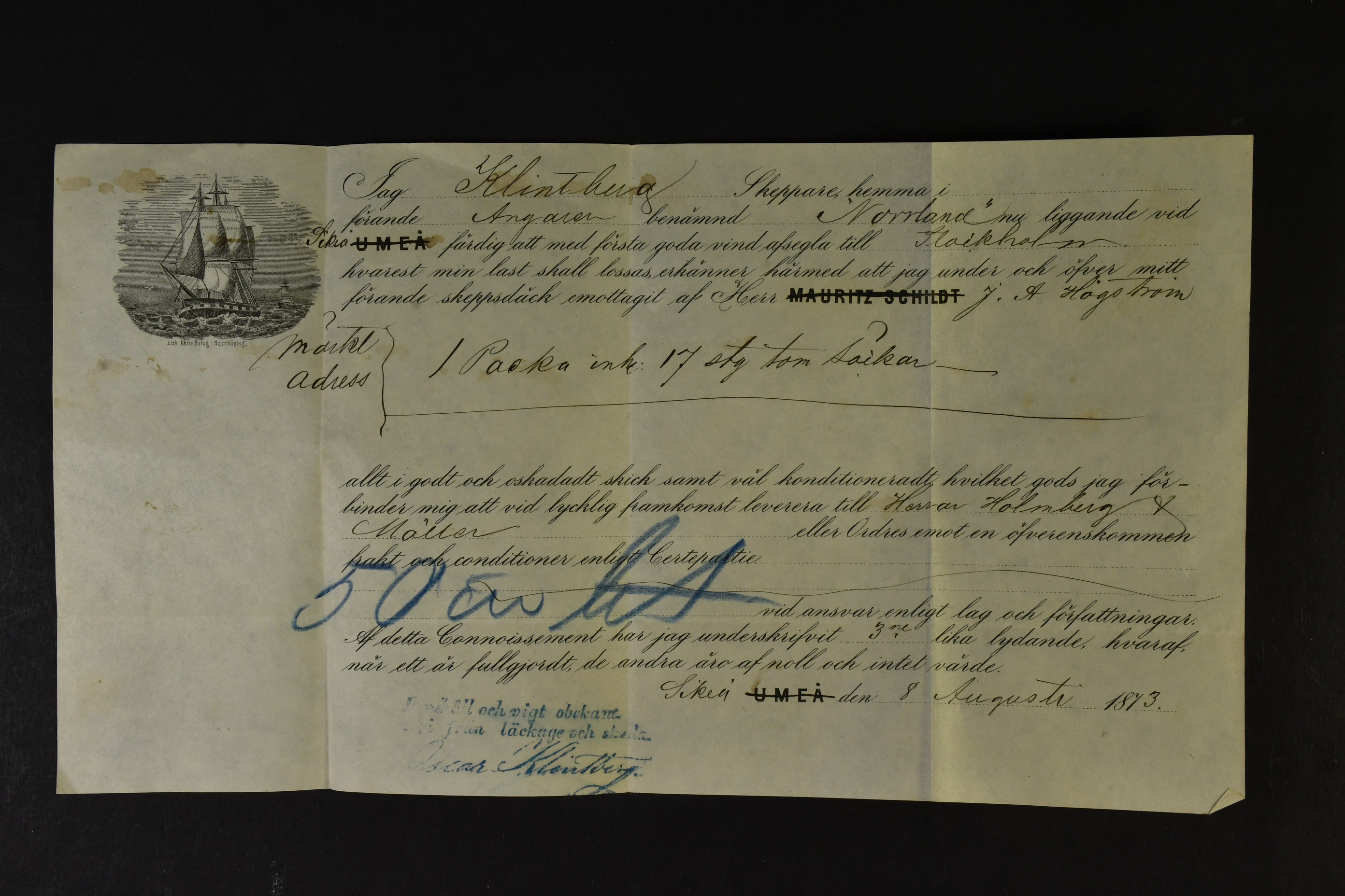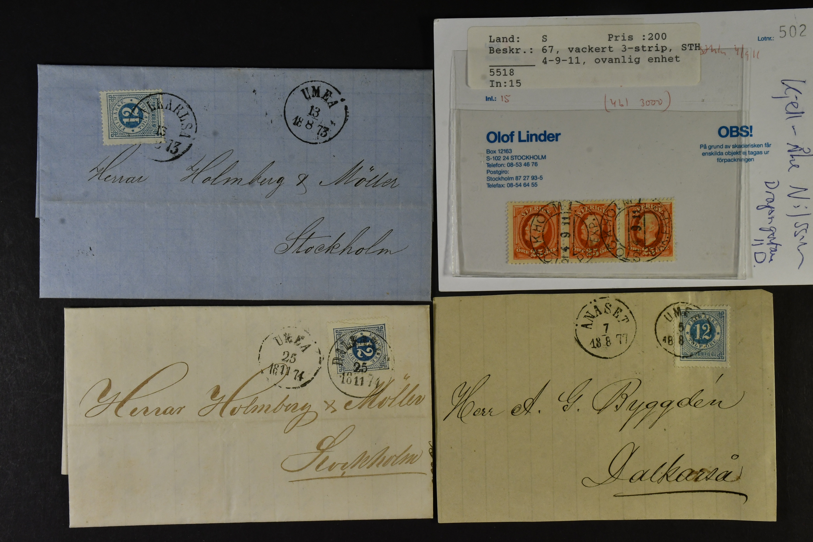 Sweden. Facit 21, etc., AC county. DALKARLSÅ 1873–74. Two letters sent via UMEÅ to Stockholm, plus one cover front sent from UMEÅ via ÅNÄSET 7.8.1877 to Dalkarså. Also one ship's bill of lading dated in "Sikeå den 8 Augusti 1873", and one used strip of three of F67. The entire lot is presented at www.philea.se. (5).