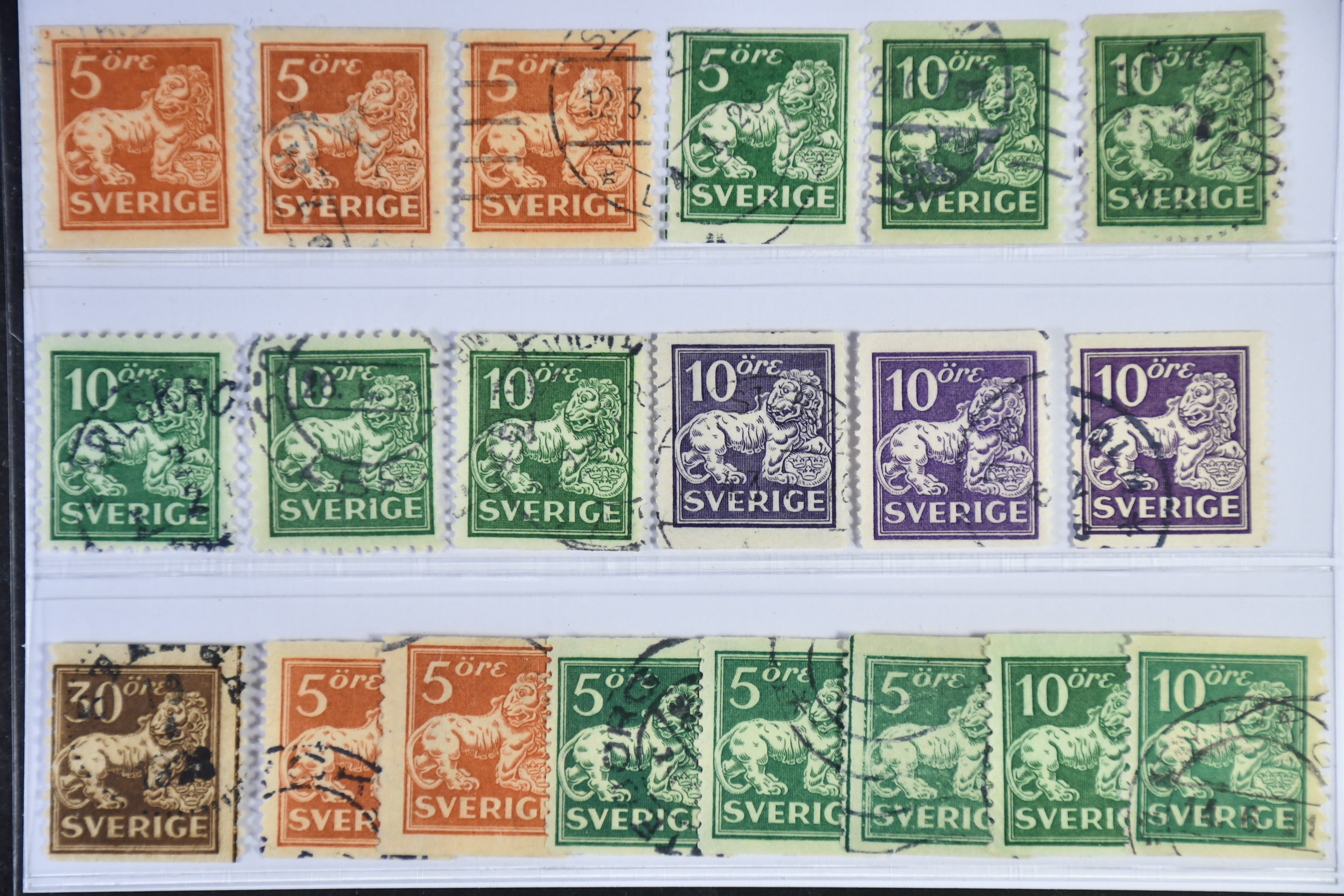 Sweden. Used 1920–1934. Standing Lion. All different, e.g. F 141bz, 142Abz+Acc, 142Acc, 144Acc+Acz+Cbz+Ccx+Ecx, 145E+Ecx, 146E, 148Acx. Mostly good quality. F SEK 7850 (20)