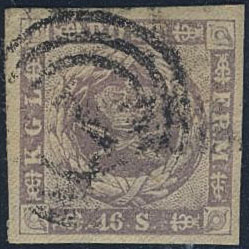 Denmark. Facit 6 used, 1857 Skilling 16S. grey-violet. Issue 1854. Cert: Kaiser (1981). SEK 1800