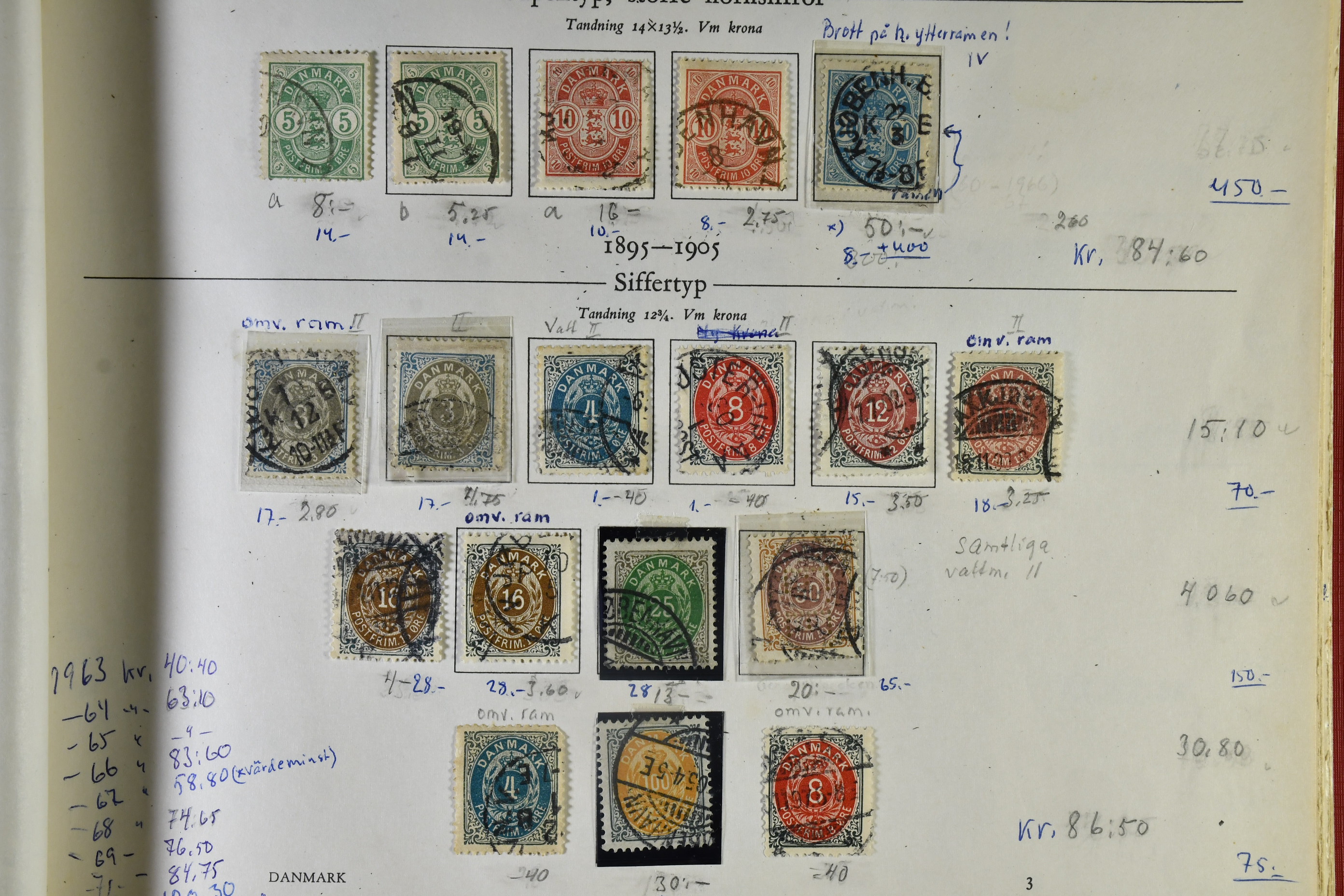 Denmark. Collection used 1851–1975 in album. Starts with a number of skilling stamps. Numeral type stamps with varieties and with different watermarks. Also some provisionals. Please see a selection of scans at www.philea.se. Mixed quality. (>300)