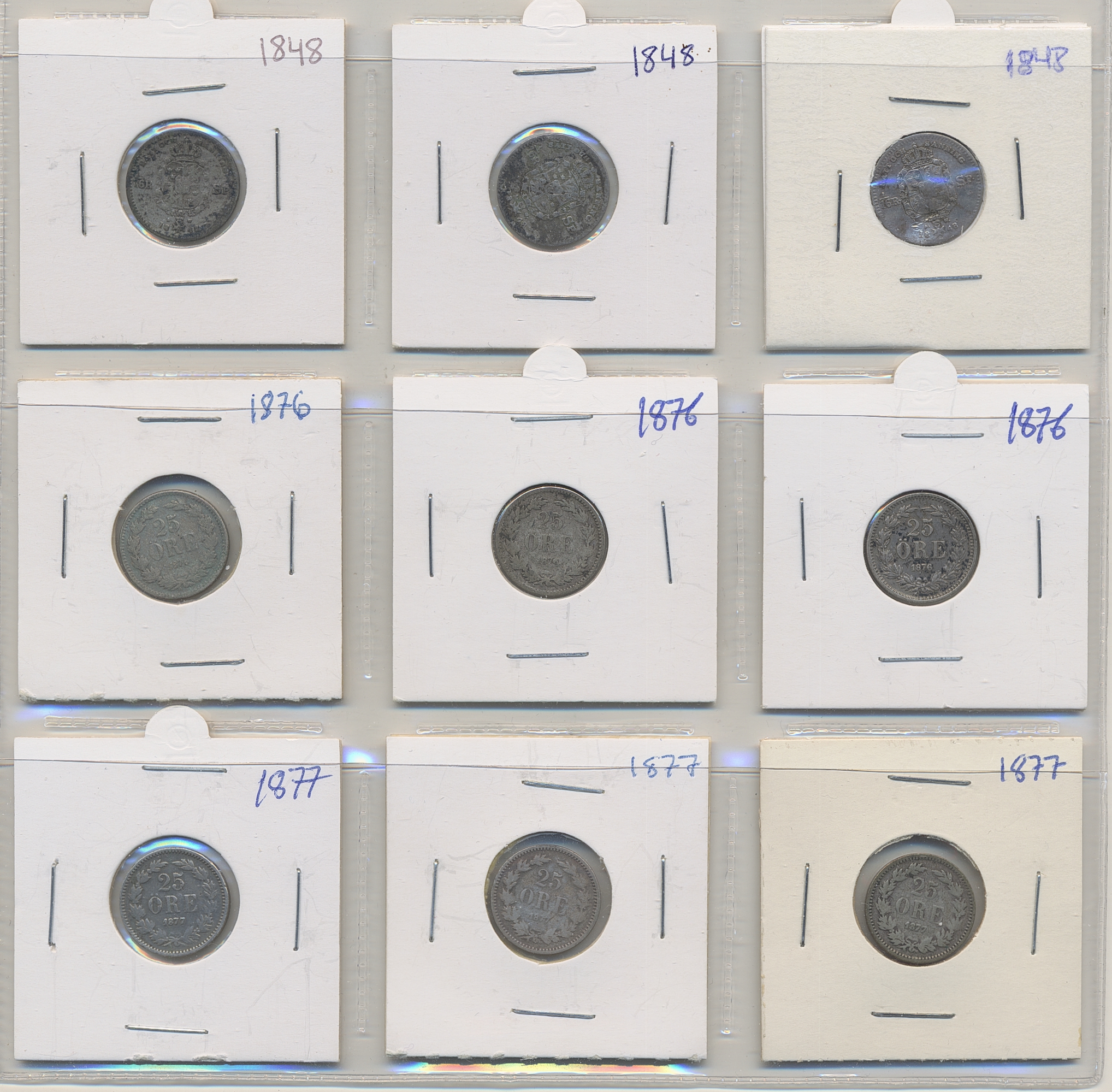 Coins, Sweden. Oskar II, Selected years in three examples each. 25 öre: 1876 and 1877. 10 öre: 1874, 1876, 1884 and 1887. Also Oscar I 1/16 Rdr Sp 1848. In total twenty-one pcs. Mostly well circulated. .